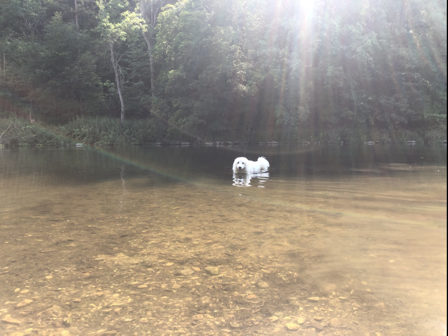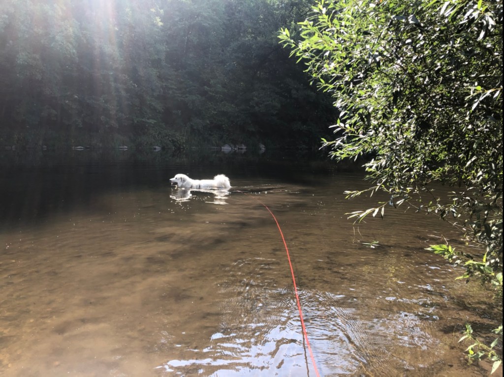 Wir sind dann noch zu meiner zweiten Badestelle gegangen. Da bin ich auch nochmal im Wasser gewesen. Aber nur kurz. Ich war ja noch ganz naß und abgekühlt vom ersten Bad. Draußen habe ich mich dann trockengeschüttelt und dann sind wir zurück zu meinem weißen französianischen Auto. Und mit dem sind wir wieder nach Hause gefahren.