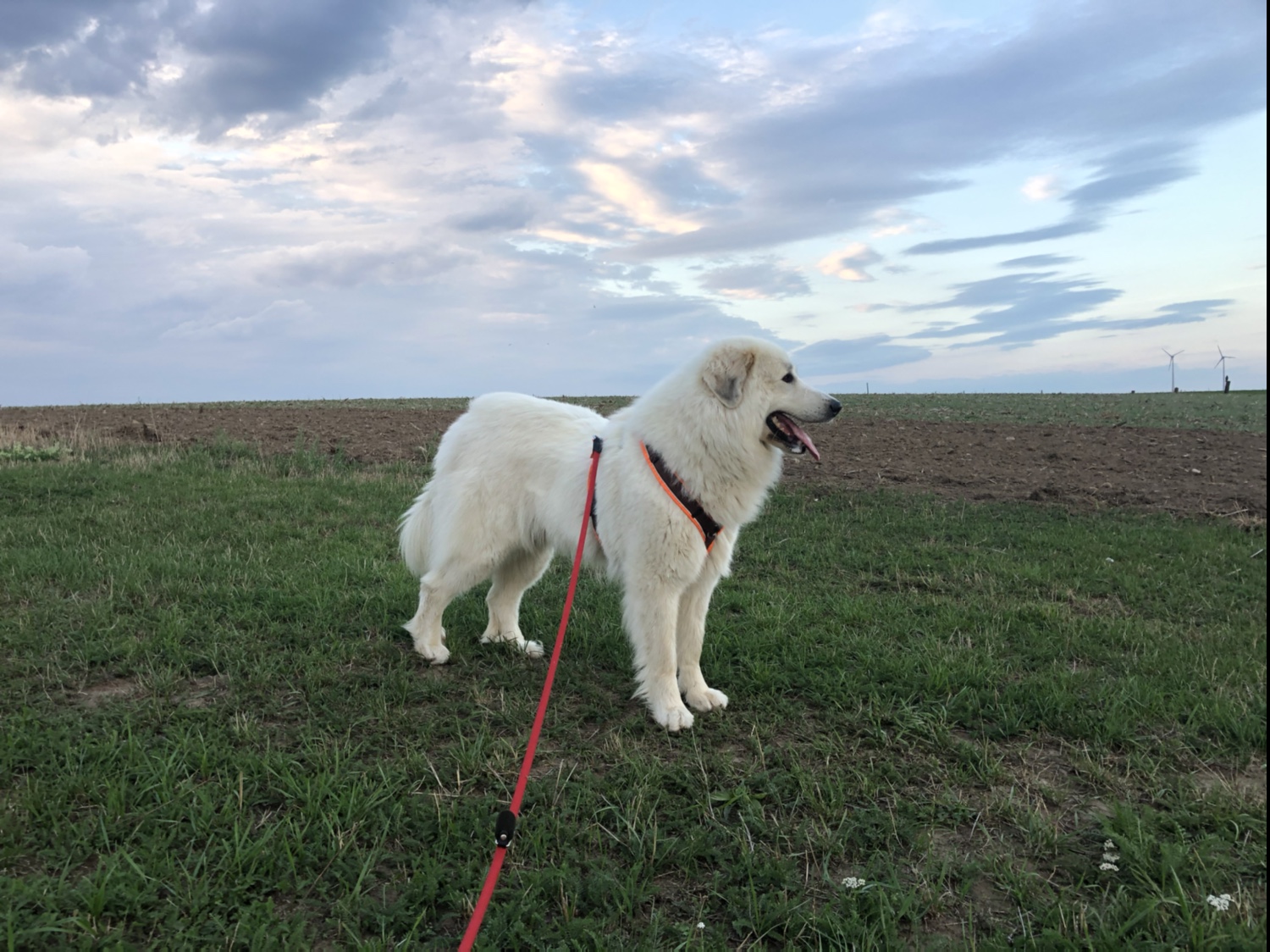 Mein Abendspaziergang ist heute erst ganz spät gewesen. Aber dafür war es nicht mehr ganz so heiß. Wir sind zu meiner großen Feldwiese gegangen. Unterwegs habe ich die Cora getroffen. In ihrem Zuhause. Da haben wir uns beschnuffelt. Und dann bin ich mit meinem großen Mensch über meine große Feldwiese geschlendert. Auf dem Rückweg habe ich auf dem großen Feldweg erst den Odin getroffen. Das ist mein Nachbar, der Spanische Wasserhund. Und dann habe ich auch noch den Askan getroffen. Der ist mein Freund. Ein Collie. Der ist schon zwölf Jahre und kannganz schlecht laufen. Wegen der Gelenke. Ich bin erst drei und kann gut laufen.
