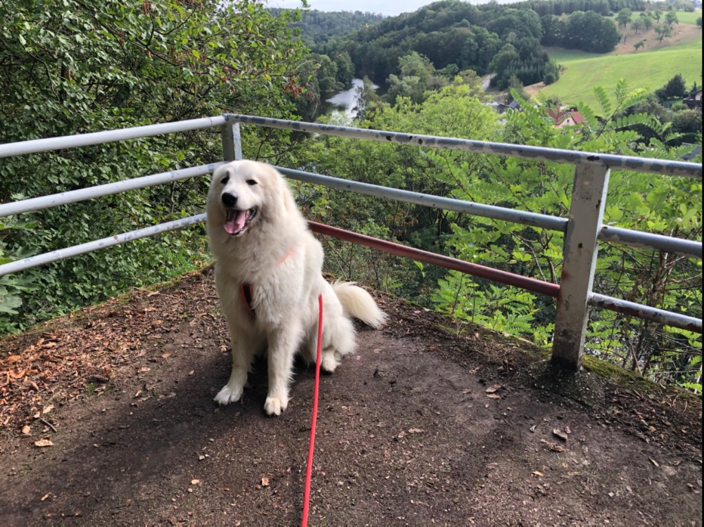 Heute ist ja ein Sonntag. Und da muß man einen Spaziergang machen. Einen Sonntagsspaziergang. Das habe ich dann auch gemacht. Mit meinem großen Mensch. Wir sind die Straße lang gegangen bis zum Stadtpark. Und dann sind wir durch den ganzen Stadtpark gelaufen. Bis zu der Treppe. Die bin ich mit meinem großen Mensch runter gelaufen. Wir sind dann auf dem Rad-Wander-Weg weiter bis zur kleinen Brücke.
