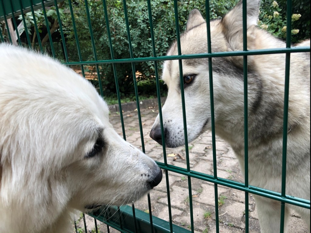 Dann sind wir über die Brücke und erstmal zum Spike gegangen. Der ist mein Freund. Der Spike ist ein Husky. Ein ganzganz lieber. Und der freut sich wenn die Bella mit ihrem großen Mensch kommt. Heute hat er schon an seinem Gartentor gewartet.