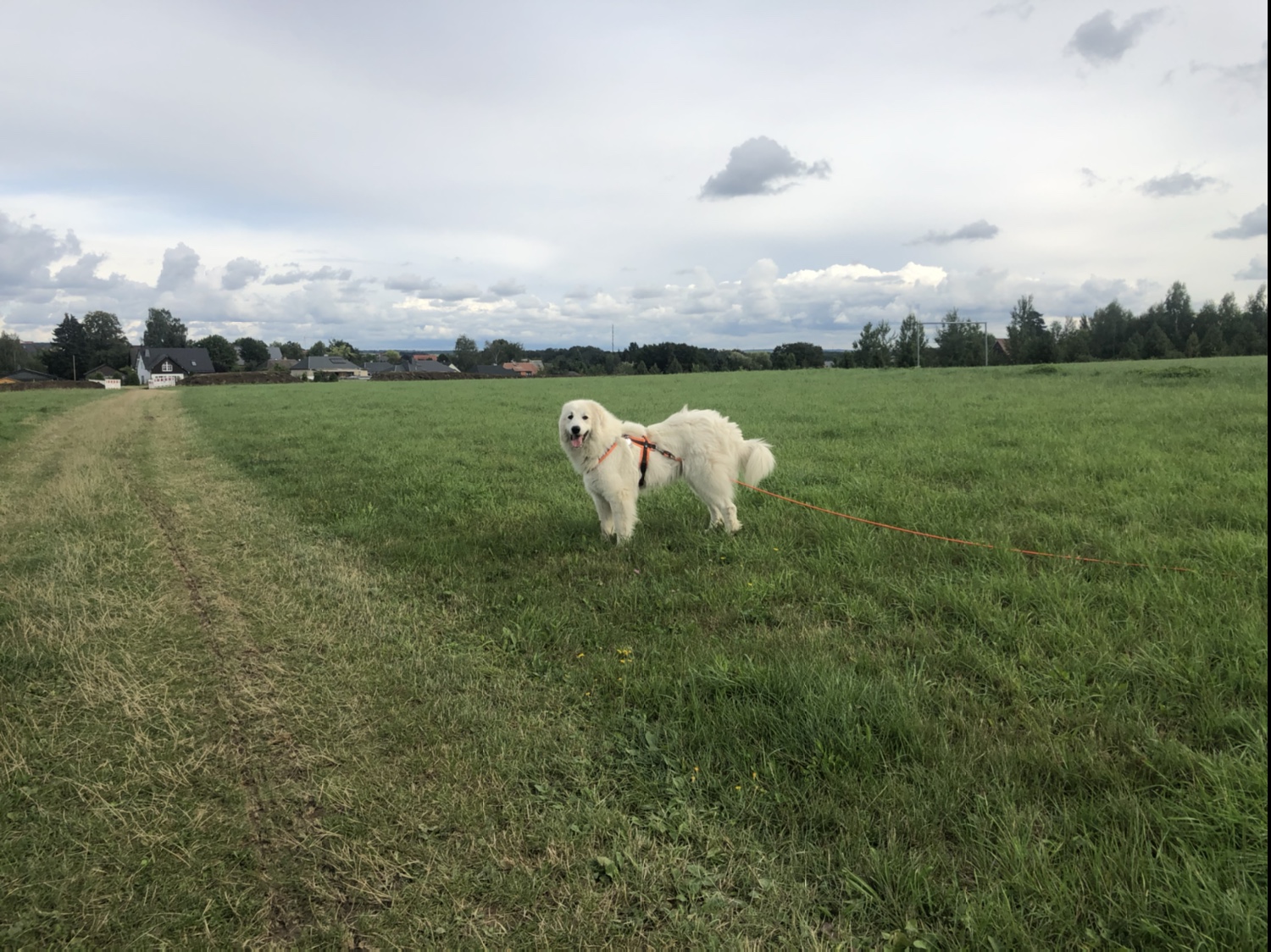 Wir sind durch mein Wohngebiet zu der großen Wiese hinter meinem Wohngebiet gegangen. Da durfte ich wieder ganz viel schnuffeln. Ganz gemütlich. Wir sind im großen Bogen über die ganze Wiese gelaufen. Und dann wieder zurück durch mein Wohngebiet nach Hause.