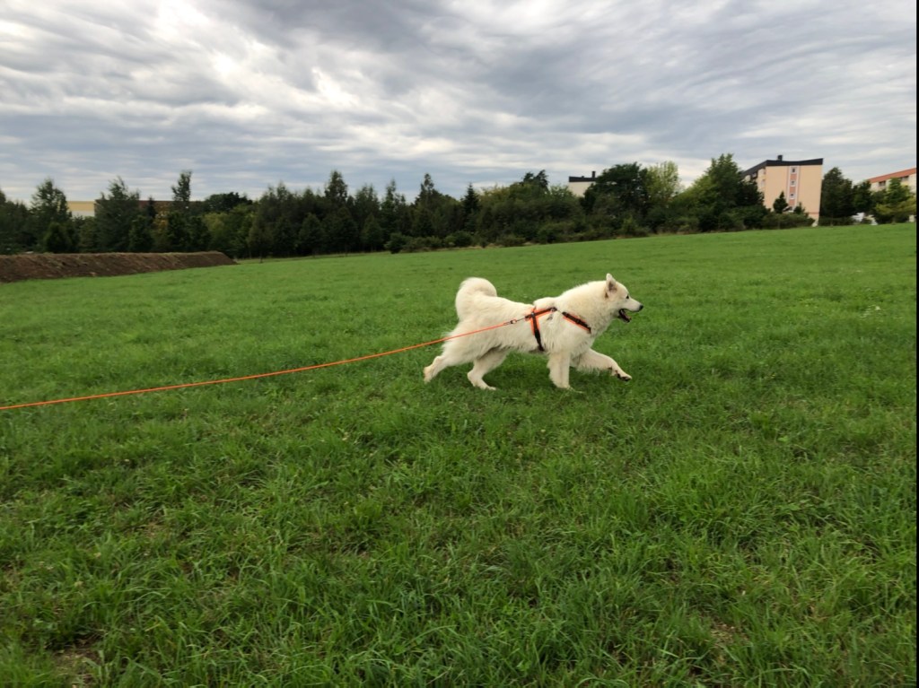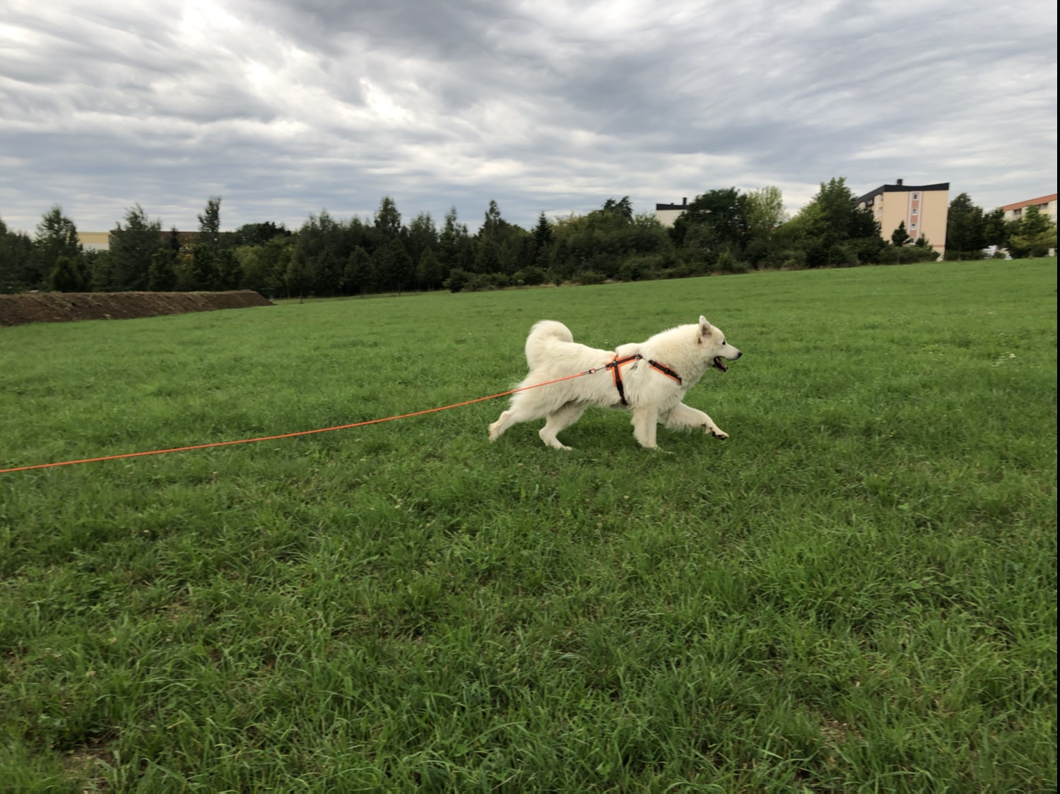 Dann bin ich durch mein ganzes Wohngebiet zur großen Wiese hinter meinem Wohngebiet gegangen. Da habe ich wieder ganz schön und gemütlich geschnuffelt. Wir sind dann weiter zum Teich und über das große Feld. Da habe ich auf der Wiese rumgetobt, weiiil, da war ganz weit weg eine Mietzekatze. Eine weiße! Und die hat sich bewegt. Über die Wiese ist sie gerannt. Ich auch. Aber dann war sie weg.