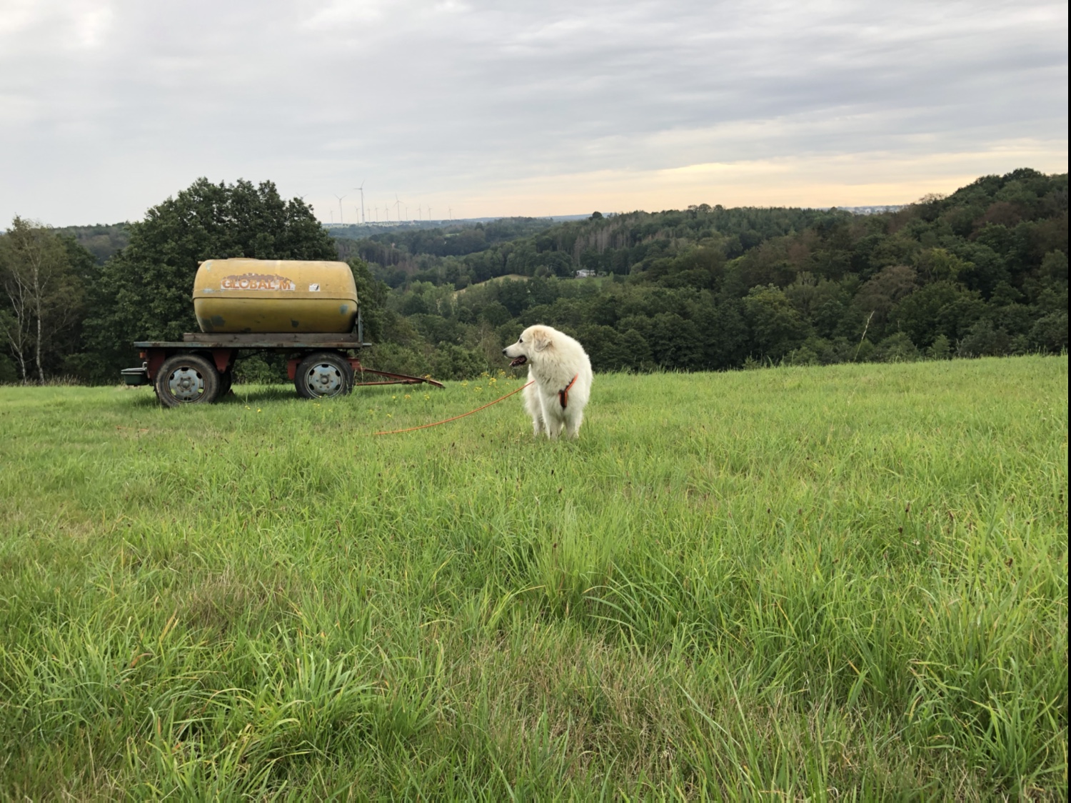 Wir sind dann um das Feld herumgelaufen und auf der anderen Seite zurück. Bei den Rehen haben wir heute nur eins gesehen. Das war aber ganz weit weg. Und auf der Wiese am Feld waren wieder die Rindviehcher. Die haben blöde geglotzt. Wie meistens. Wir sind aber weitergegangen. Bis zum Skihaus. Da habe ich erstmal schön Wasser getrunken. Da hat nämlich jemand für mich einen Hänger mit einem großen Wasserfaß hingestellt. Und einer Tränke dran und daraus kann man trinken. Mein großer Mensch sagt, das ist eigentlich für die Rindviehcher. Ich denke aber, das ist für Hunde, die hier spazierengehen. Aber die Rindviehcher dürfen auch was trinken. Ist ja genug da.