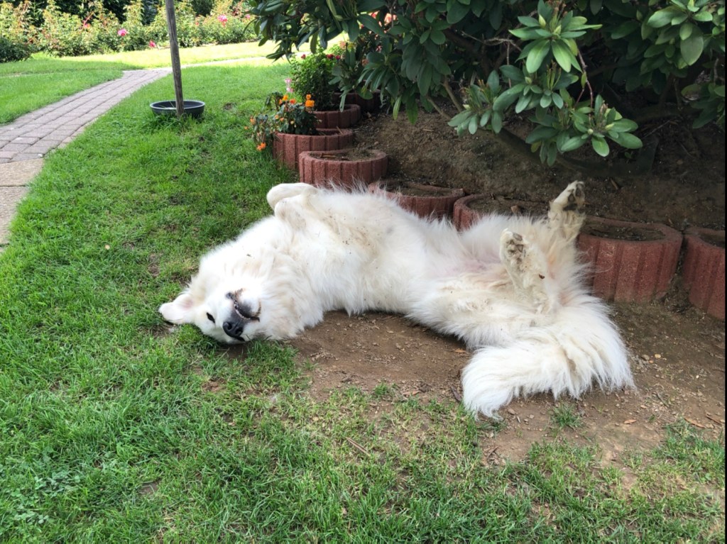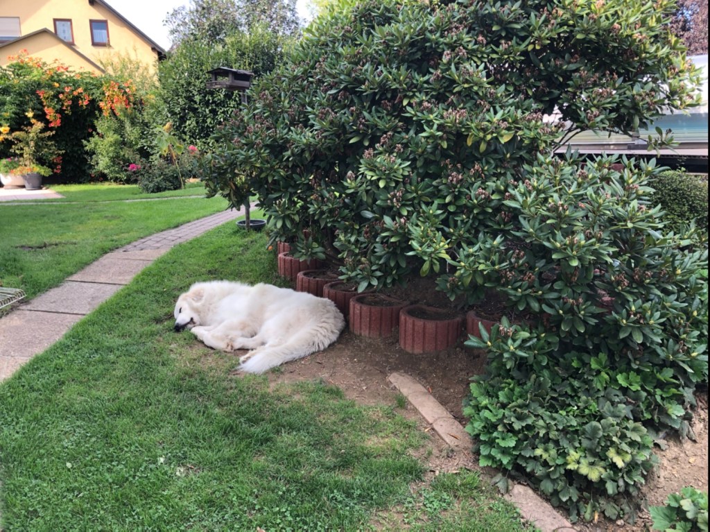 Im Wohngebiet habe ich mich an einem schönen schattigen Plätzchen erstmal ganz lange ausgeruht. Dann sind wir schnell nach Hause gegangen. In meinen Garten. Meine große Menschin hat schon den Weg vor meiner Kellertreppe angefangen neu zu pflastern. Meine Menschen haben dann noch den ganzen Tag in meinem Garten gearbeitet. Jetzt ist alles wieder ganz neu und ganz schön. Heute mußte ich auch nicht in meiner Kellerwohnung bleiben. Ich war den ganzen Tag mit im Garten. Ich mache auch nichts kaputt. Bin ja eine liebe Pyri.