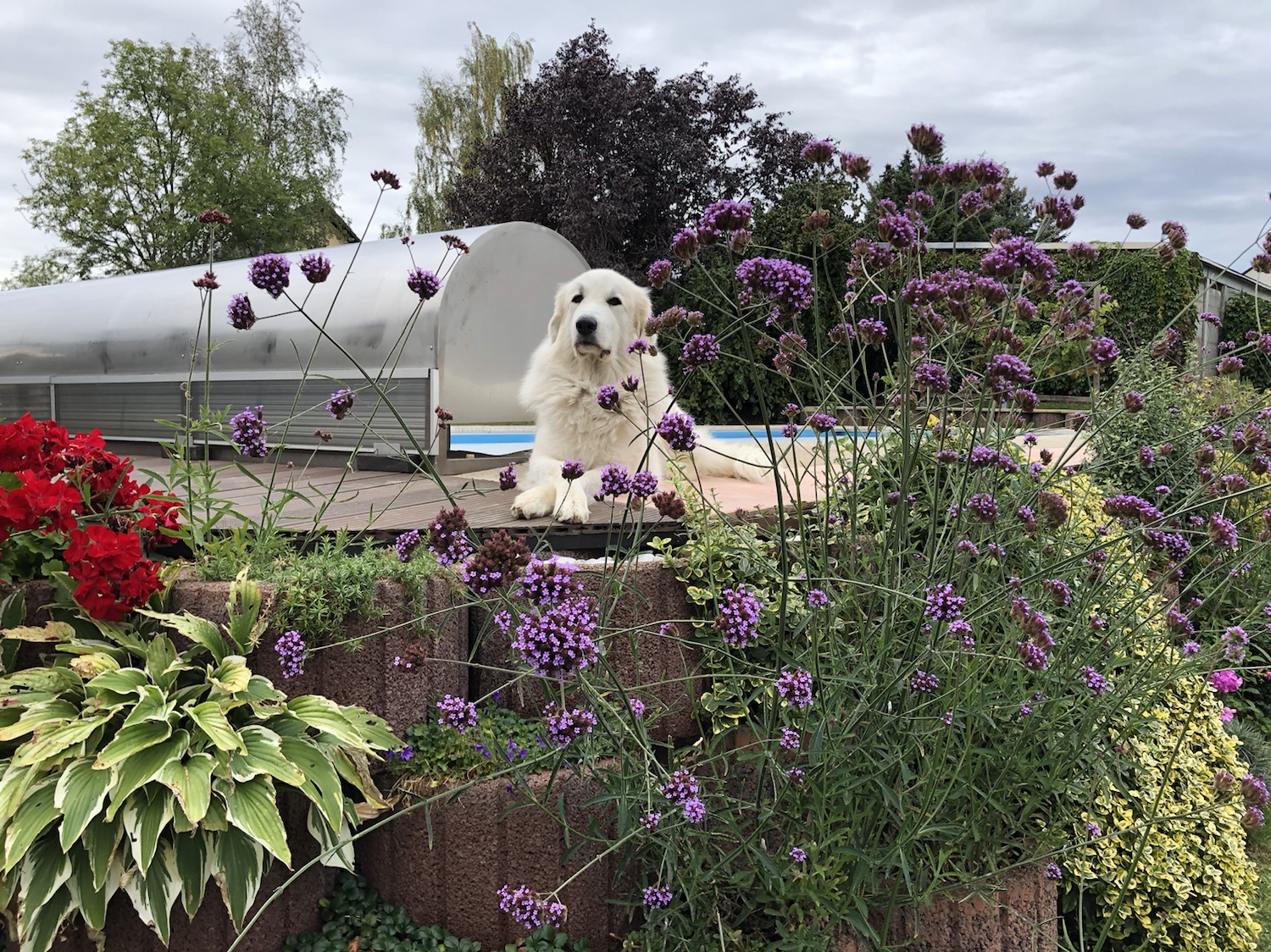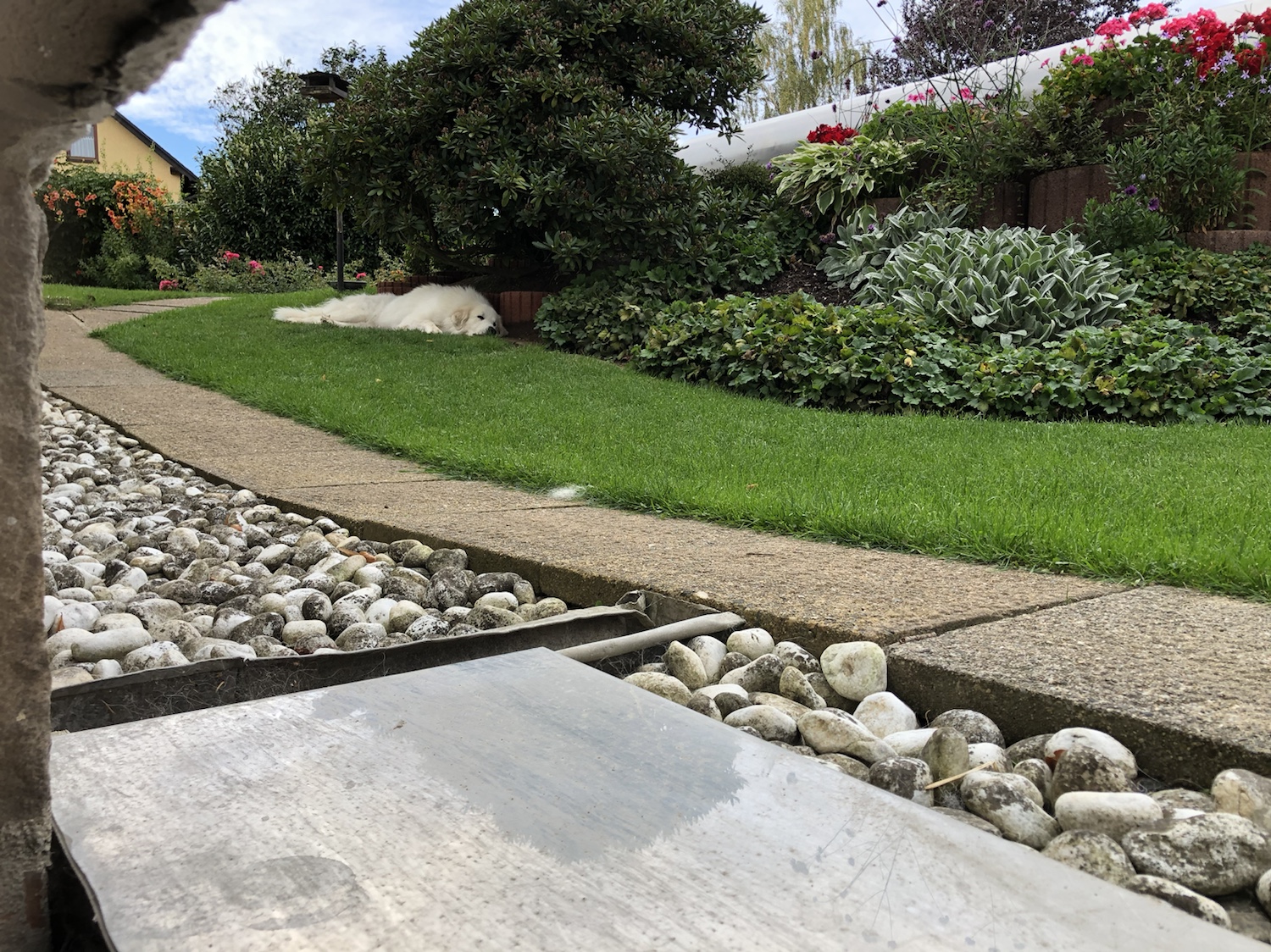 Später bin ich wieder in meinem Garten gewesen. Da ist meine Arbeit. Ich bewache alles und lasse niemanden rein. Und ich schimpfe, wenn jemand zu nahe an meinen Garten rankommt.