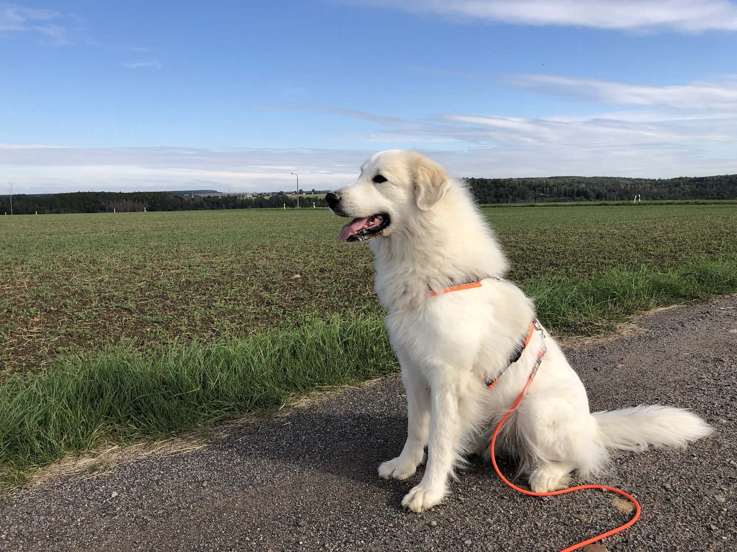 Dort hat die Kangalin schon auf mich gewartet und mich angewufft. Aber ganz lieb. Nicht böse. Ich bin ja auch lieb. Und im Nachbargarten hat auch der kleine Hund gewufft. Auch ganz lieb. Ich bin mit mejnem großen Mensch aber weiter am Waldrand lang über das Feld und die Wiese gewandert.