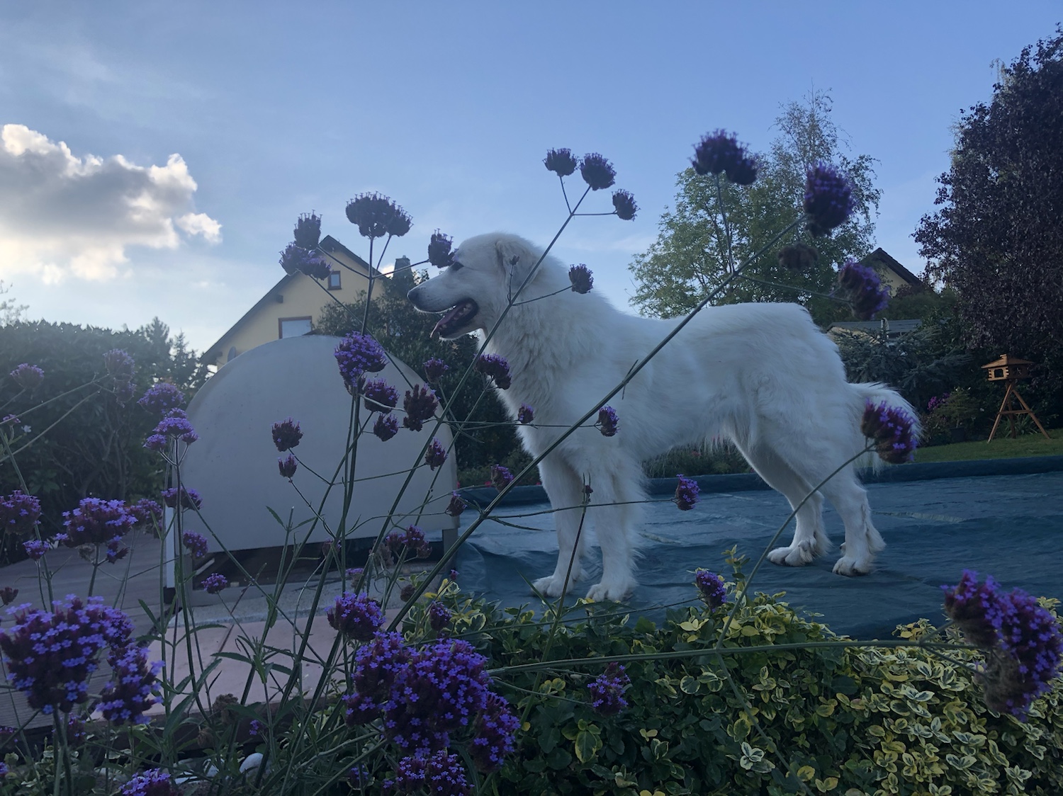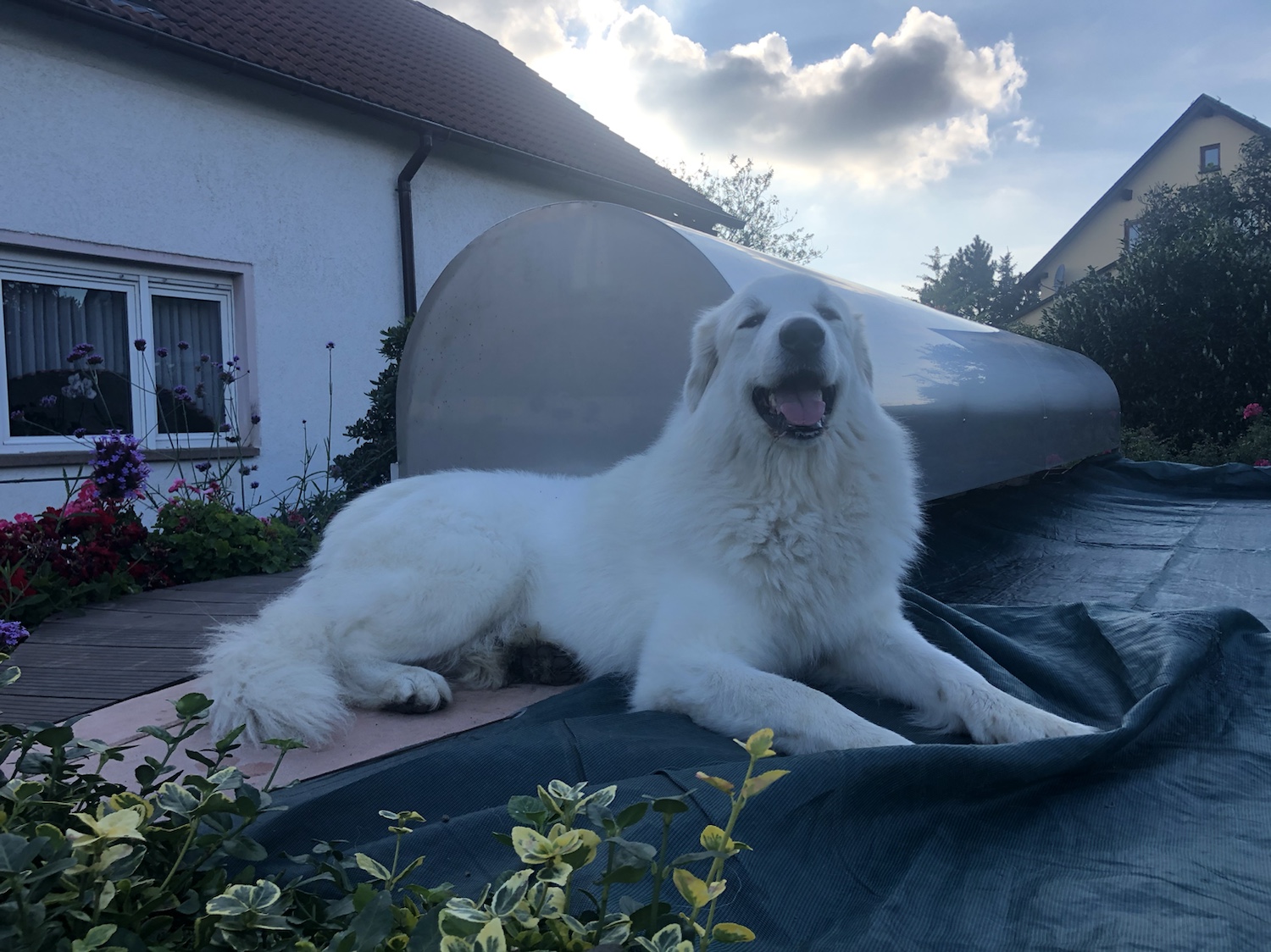 Und dann bin ich noch mit meinem großen Mensch in meinem Garten gewesen. Wir haben gespielt und schön gekuschelt. Auf der Wiese und an meinem Pool. Aber dann sind wir rein in meine Kellerwohnung. Bürsten und dann gleich noch Abendfuttern. Aber danach bin ich gleich wieder raus in meinen Garten. Mit einem Hühnerfuß. Den habe ich geknabbert.