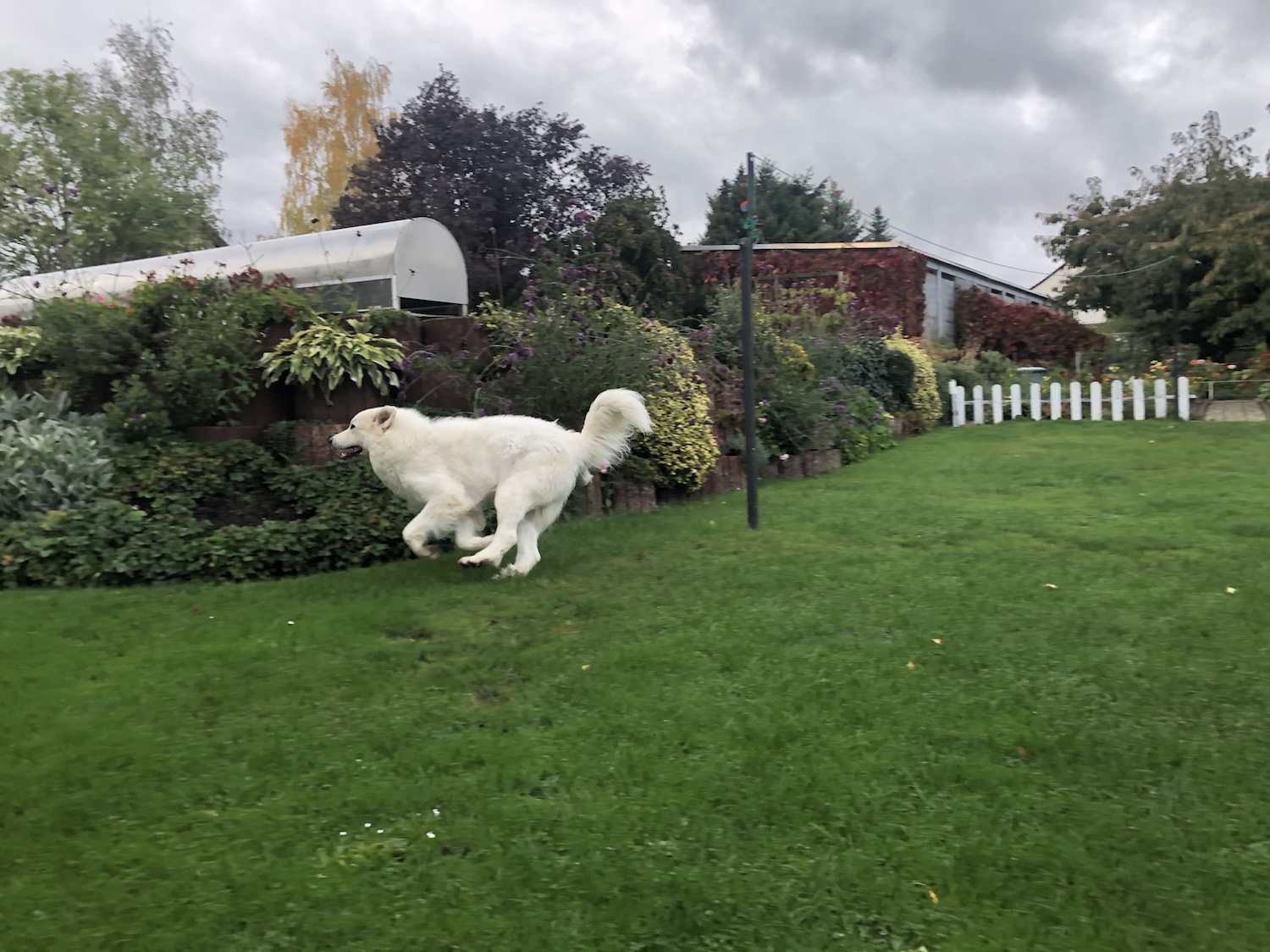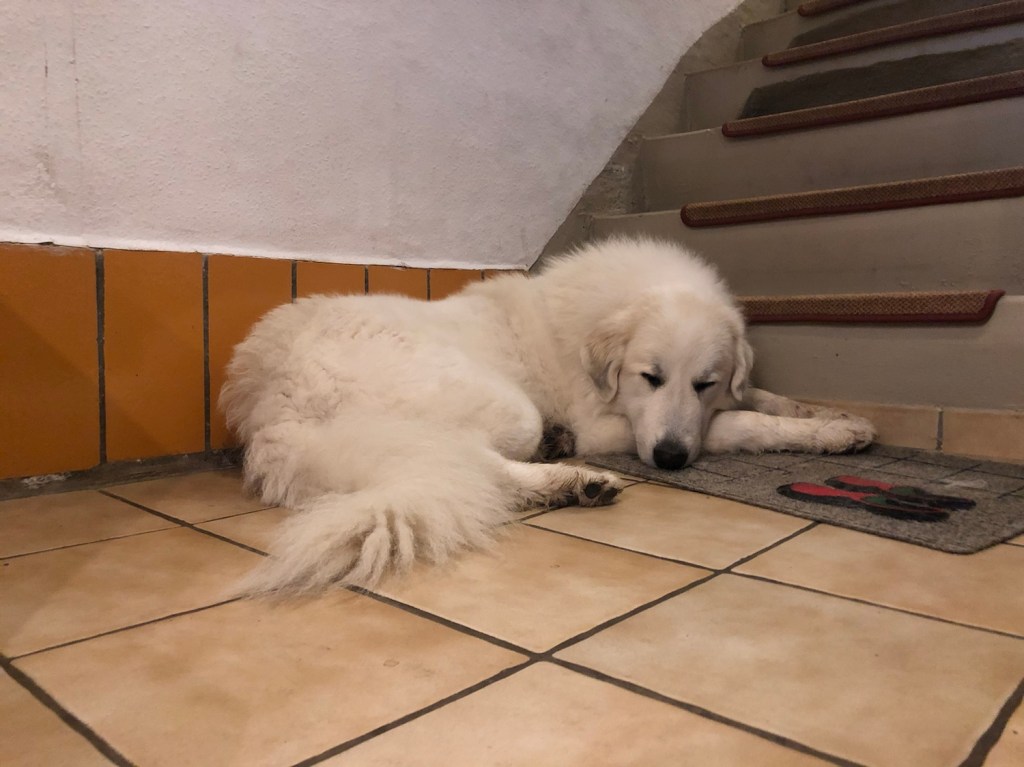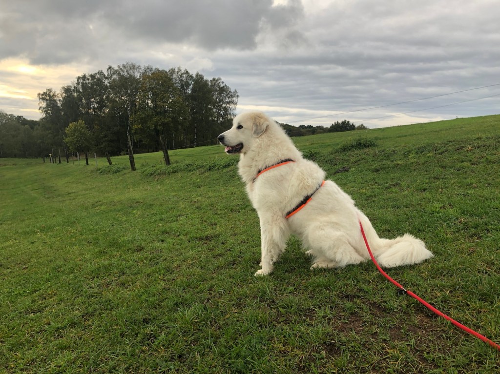Heute ist wieder Matschepampewetter gewesen. Aber ich habe mit meinem großen Mensch einen Morgenspaziergang gemacht. Durch die Siedlung. Und da hat es nicht mehr geregenwettert. Weil ich so ganz lieb gelaufen bin, durfte ich auf dem Heimweg bestimmen, wo wir langgehen. Ich bin eine Herdenschutzhündin, ich kann ganz alleine Entscheidungen treffen. Jawoll.