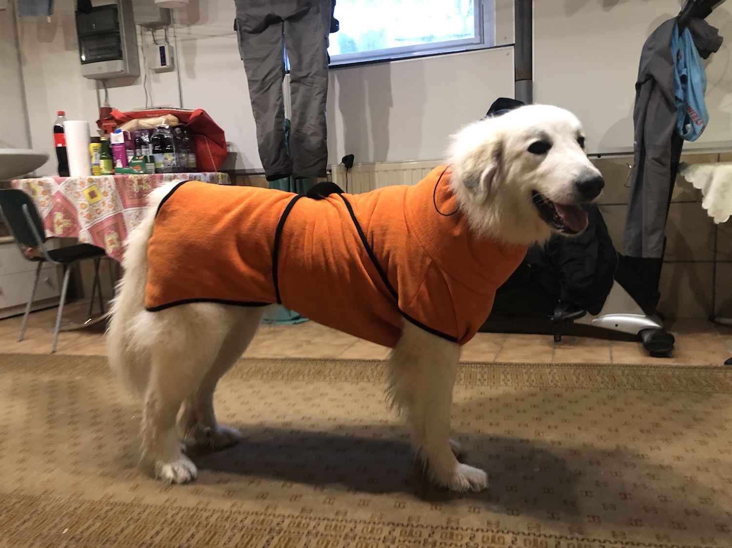 Zu Hause bin ich gleich mit meinem großen Mensch in den Keller und unter die Dusche. Mein großer Mensch hat mich wieder ganz sauber geduscht. Und danach habe ich meinen orangenen Bademantel angezogen bekommen. Meine Mami Ivy hat auch so einen.