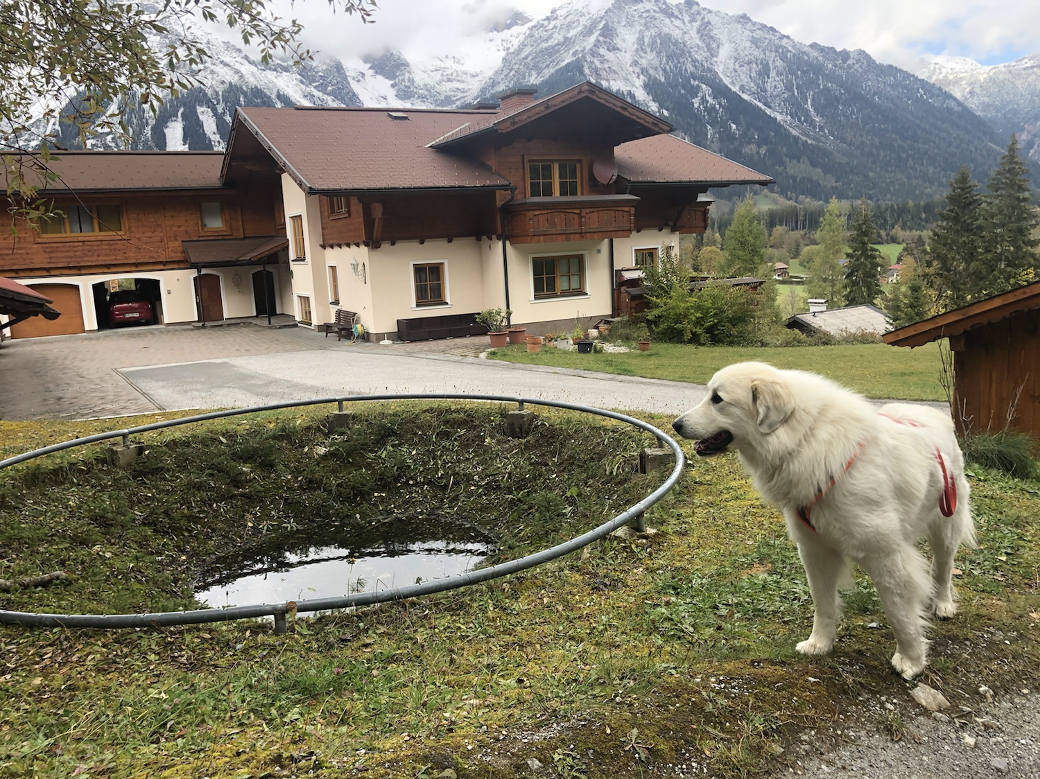 So, heute früh bin ich gleich mal ganzganz zeitig aufgestanden. Obwohl Wochenende ist. Sonntag. Da muß man einen Sonntagsspaziergang machen! Aber heute fährt die Bella lieber in ihren Urlaub. Ins Österreich 🇦🇹! Zu den Bergen! Ich bin eine Pyrenäenberghündin!