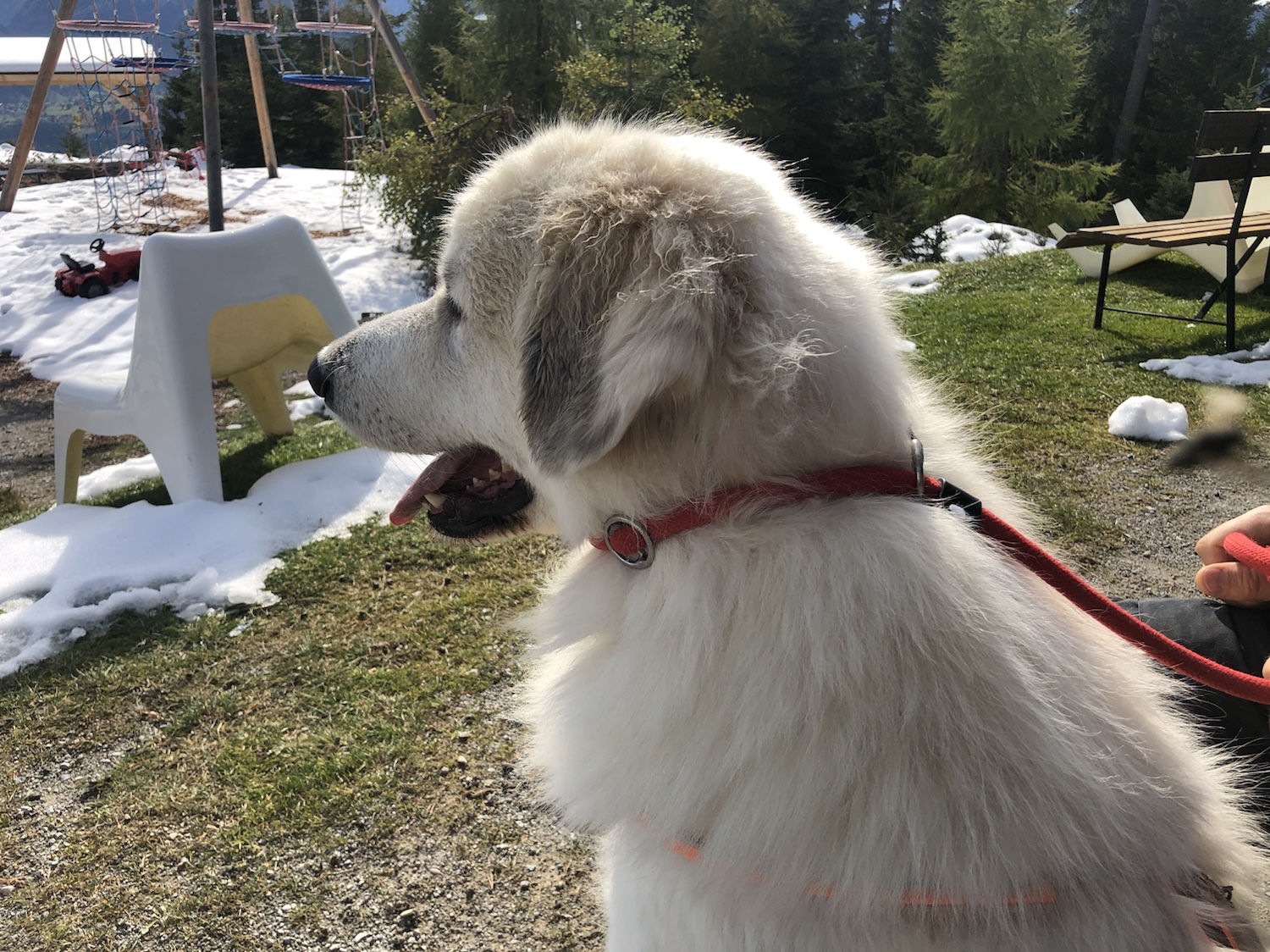 Wir haben ganz schönes Wetter gehabt. Und oben auf dem Berg war schönes weißes, trockenes Wasser. Da habe ich mich gewälzt. Und ein Hase war da. Mit dem wollte ich spielen. Aber da ist er weggehoppelt. Hasen hoppeln. Ich schnuffel lieber.