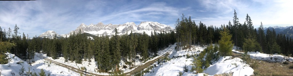 Am Gipfelkreuz haben wir herrlich klare Sicht – zum Dachsteinmassiv in die eine, bis zum Großglockner in die andere Richtung. Dann geht es wieder bergab. An der „Sonnenalm“ machen wir Mittagspause. Hier sind dann doch noch ein paar Leute unterwegs.
