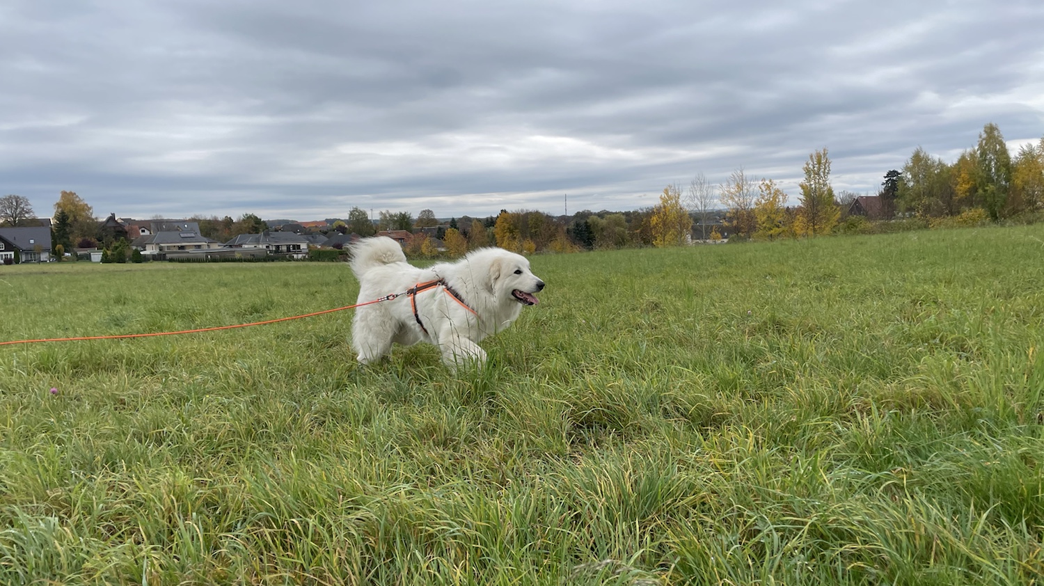 Zuerst sind wir durch mein Wohngebiet und zur großen Wiese hinter meinem Wohngebiet. Da habe ich erstmal ein Häufchen gemacht. Das haben wir gleich zur Hundetoilette gebracht. Das macht man nämlich so!