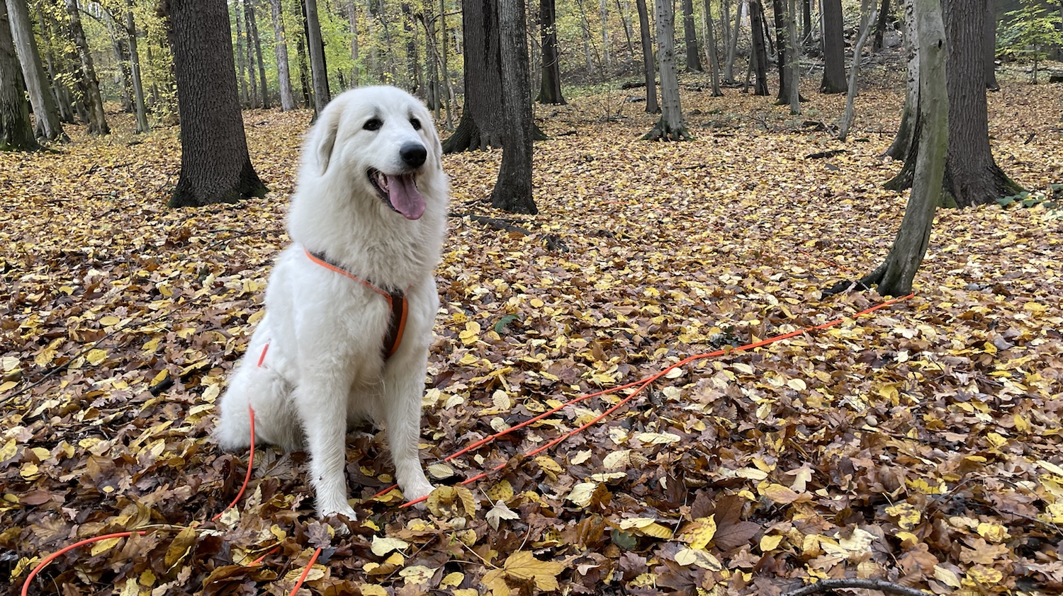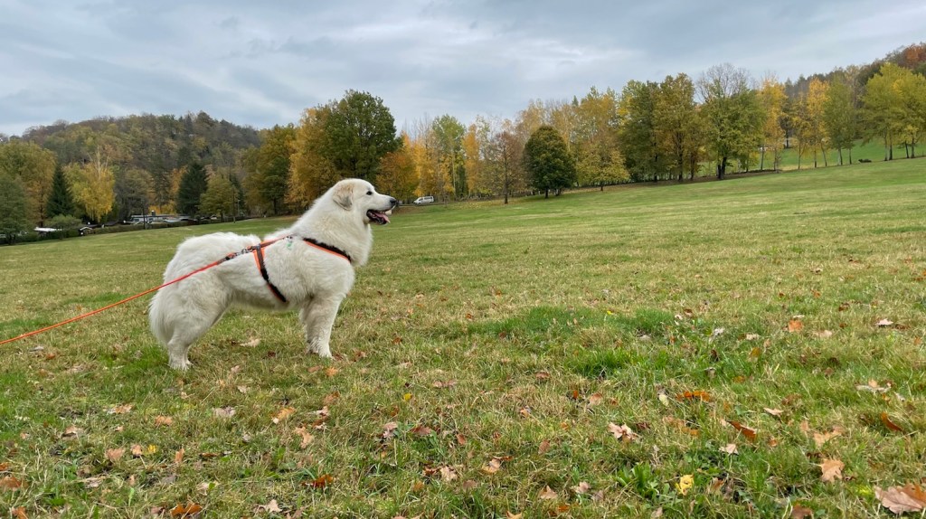 Ich bin mit meinem großen Mensch dann quer über die Wiese zur Fuchsfarm, weiiil, zum Skihang konnten wir nicht gehen. Da versperren die Rindviehcher immer noch den Weg. Ich bin dann aber vor der Fuchsfarm abegebogen und Richtung „Waldhaus“ durch den bunten Raschellaubwald gegangen. Da ist schön. Im Herbst gibt es ganz viel buntes Raschellaub. Deshalb ist der Herbst auch eine meiner vier Lieblingsjahreszeiten!