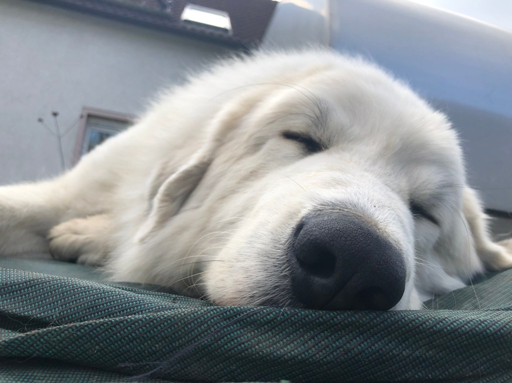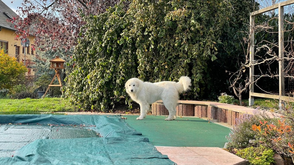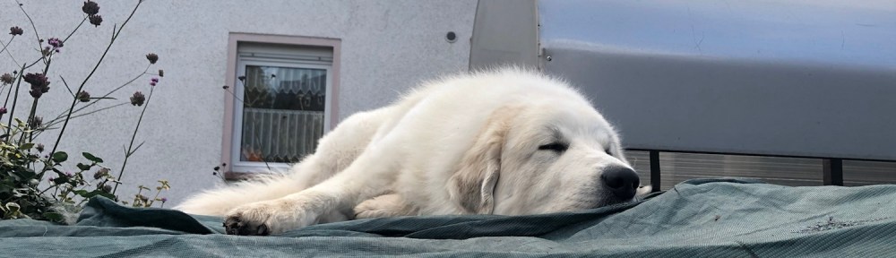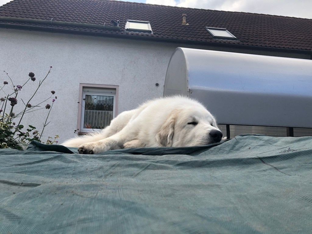 Als es dann draußen gar nicht mehr dunkelfinster gewesen ist, bin ich in meinen Garten zu meiner Arbeit. Ich habe heute wieder ganz viel auf meinem Wachposten an meinem Pool gelegen und geschlummert. Und dabei auf alles aufgepaßt! Das ist meine Aufgabe. Bin ja eine Herdenschutzhündin. Eine Pyri bin ich, eine Pyrenäenberghündin! Jawoll!