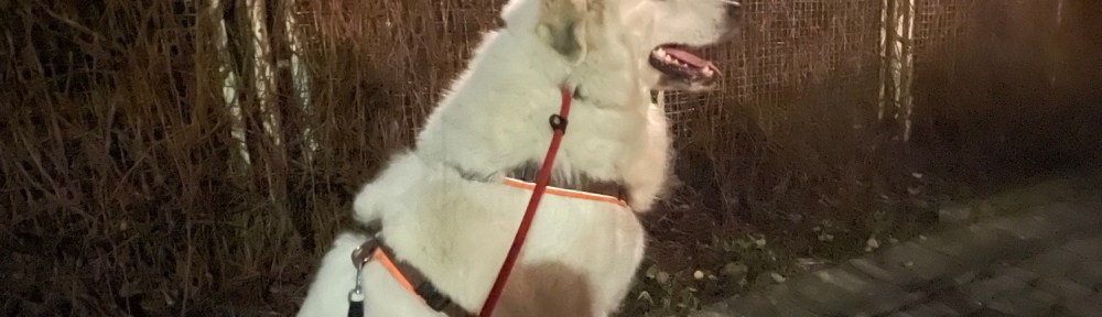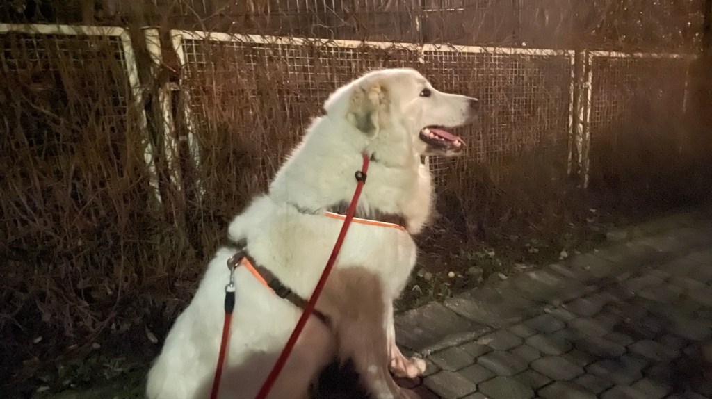 Nach dem Abendfuttern habe ich wieder in meinem Garten die Leute angeschimpft. Damit keiner zu nahe an meinen Garten rankommt. Und dann sind wir abendspazierengegangen. Mein großer Mensch und seine Bella. Das bin ich, die Bella. Wir sind durch mein Wohngebiet geschlendert. Da leuchten jetzt schon viele Lichter und das sieht schön aus.