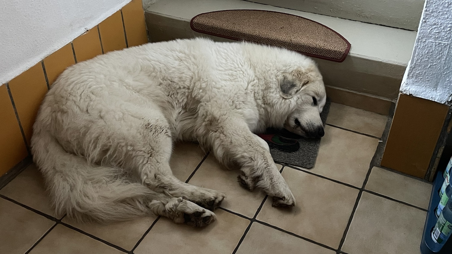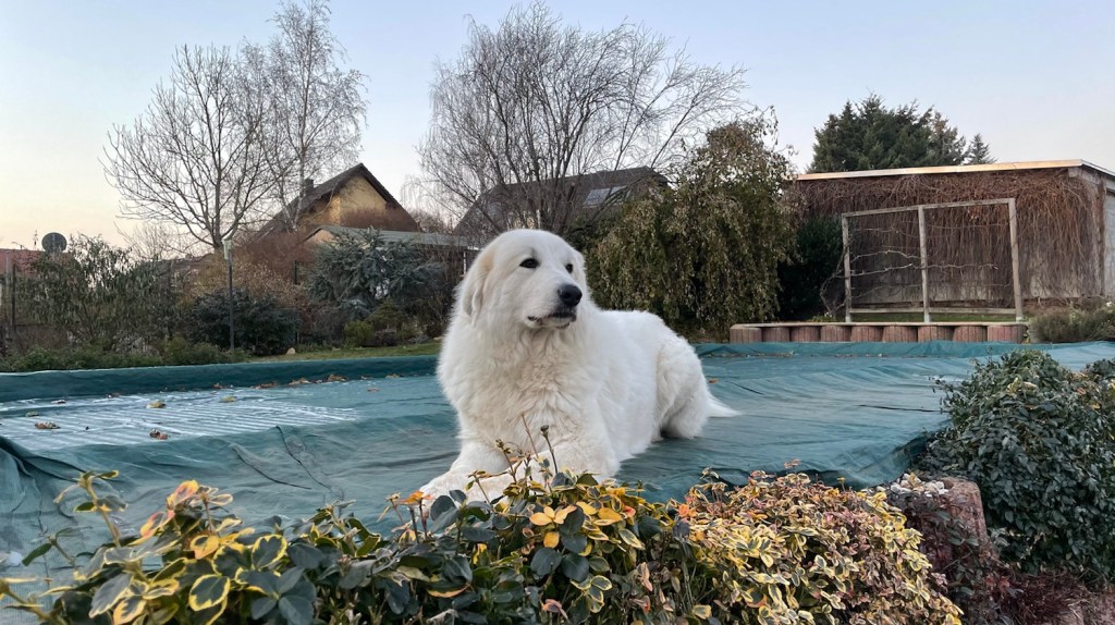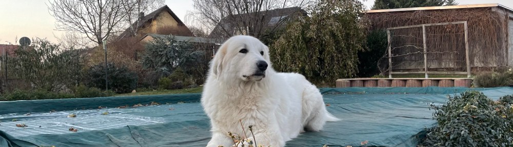 Da habe ich wieder auf alles aufgepaßt und ganz viel geschimpft. Ich muß ja meinen Garten bewachen. Ich bin eine Herdenschutzhündin. Eine Pyri bin ich. Eine Pyri ist eine Pyrenäenberghündin. Also sowas wie ich. Mein Papi Hadrien kommt aus den Pyrenäen. Das sind große Berge. In Französien. Ganz weit unten.