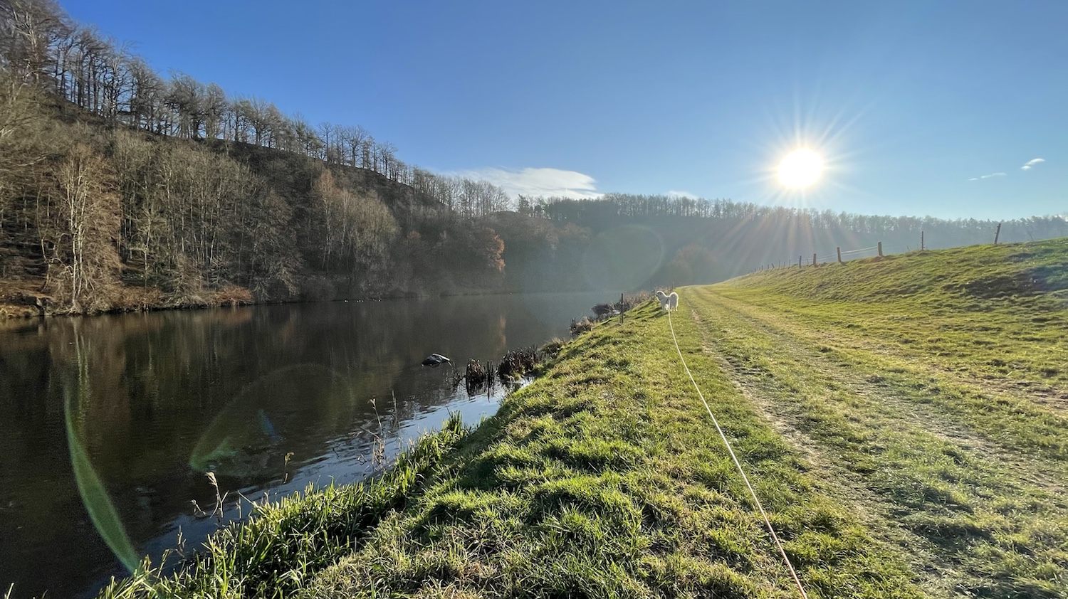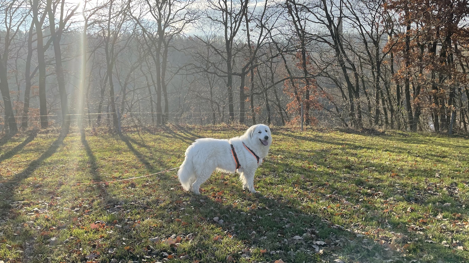 An der großen Wiese war ich kurz an den Höhlen schnuffeln. Da wohnt der Fuchs. Oder der Dachs. Oder ein riesiges Ungeheuer. Das weiß ich nicht so genau. Und dann habe ich mit meinem großen Mensch ein Picknick gemacht. Auf der großen Wiese. Und wir haben rundherum geguggt. Das ist schön. Der weiße Reiher ist auch gerade von seinem Morgenspaziergang zurück auf seinen Baum geflogen gekommen. Das habe ich beobachtet.