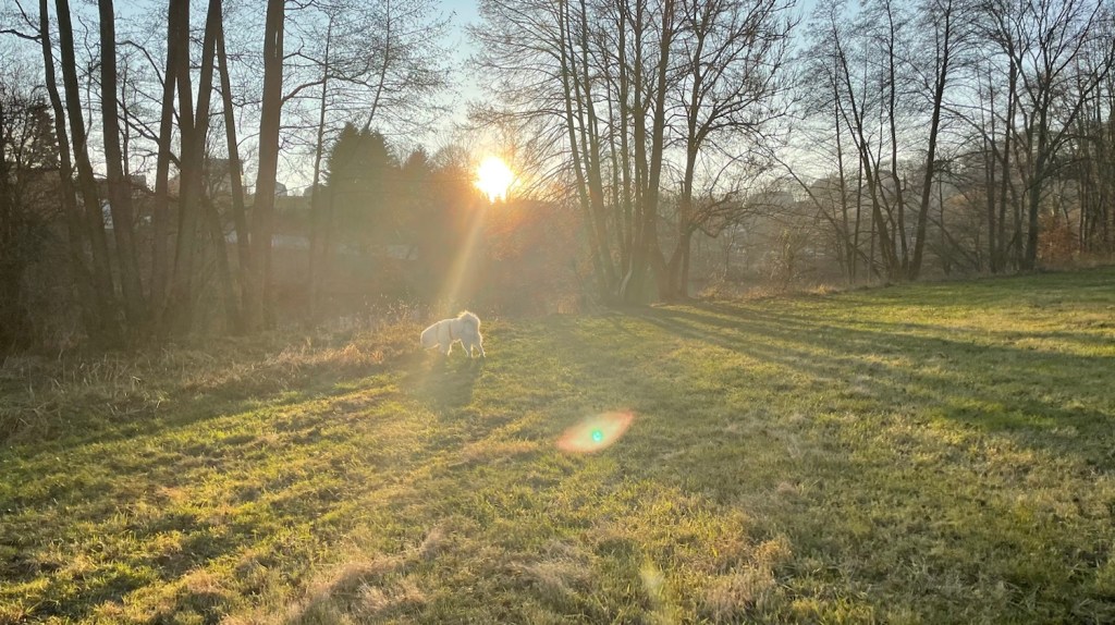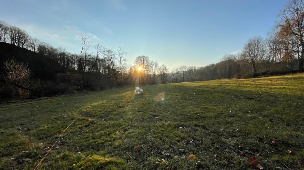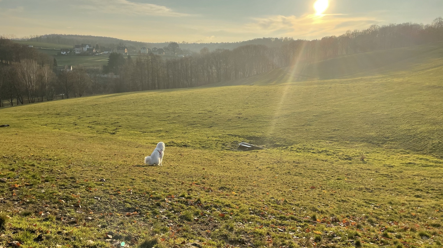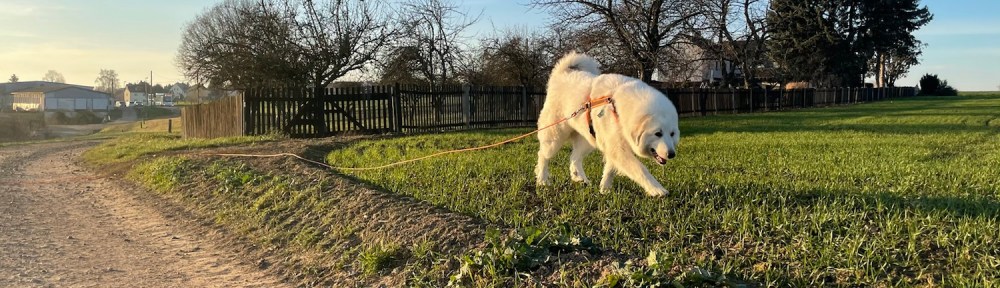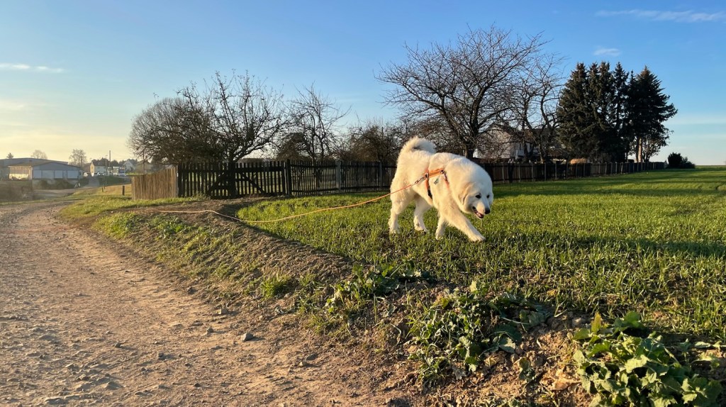 Nachmittags bin ich dann mit meinem großen Mensch spazieren gegangen. Zum großen Feldweg. Da habe ich meine lange orangene Feldleine bekommen und dann habe ich meinen großen Mensch den Feldweg langgeführt. Bis zum kleinen Feldweg. Da sind wir abgebogen und zur großen Wiese gegangen. Ich bin immer vorneweg. Ich kenne mich hier aus!
