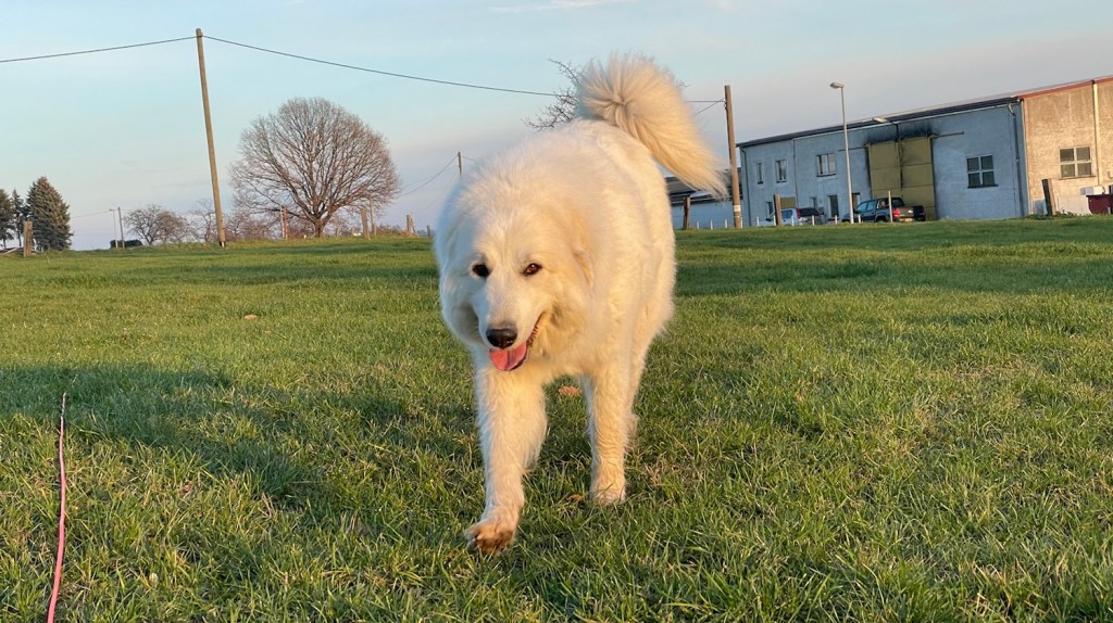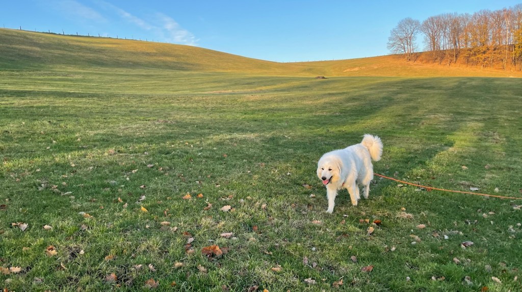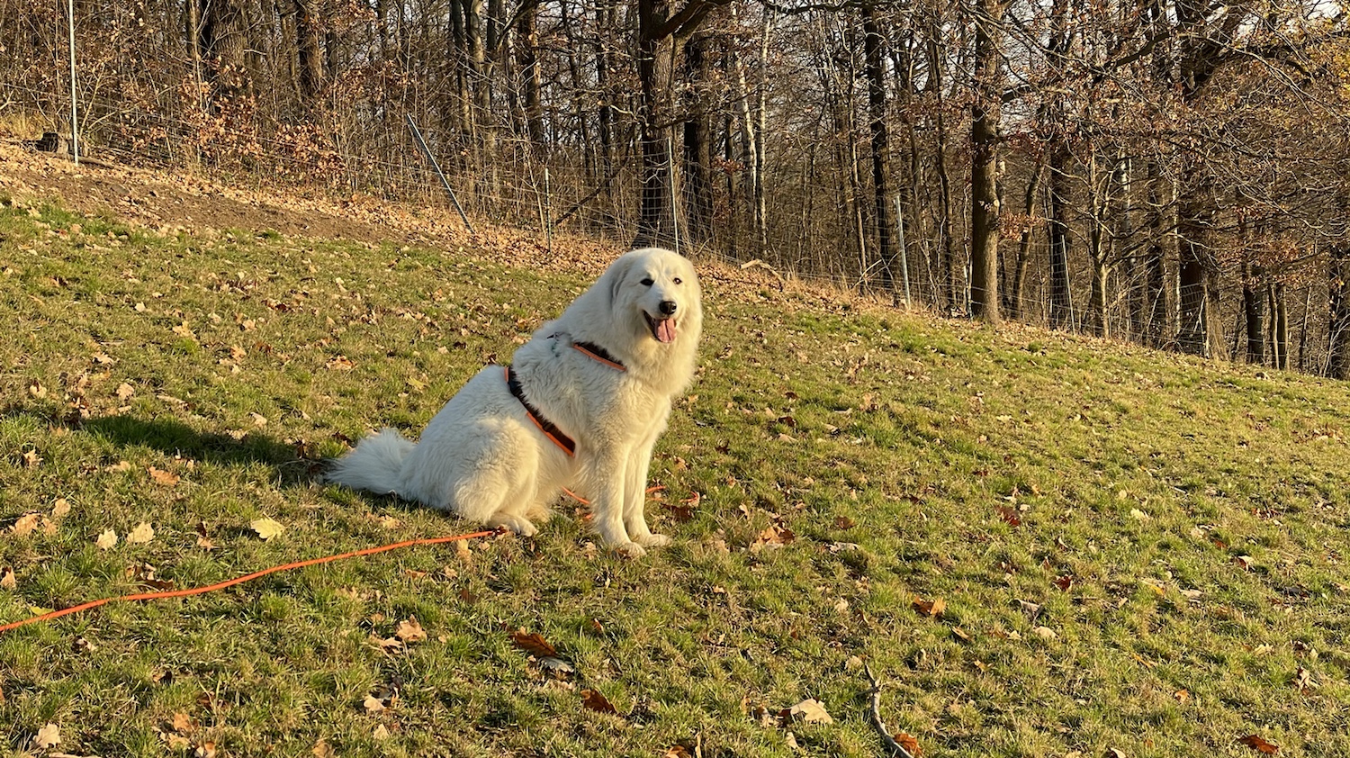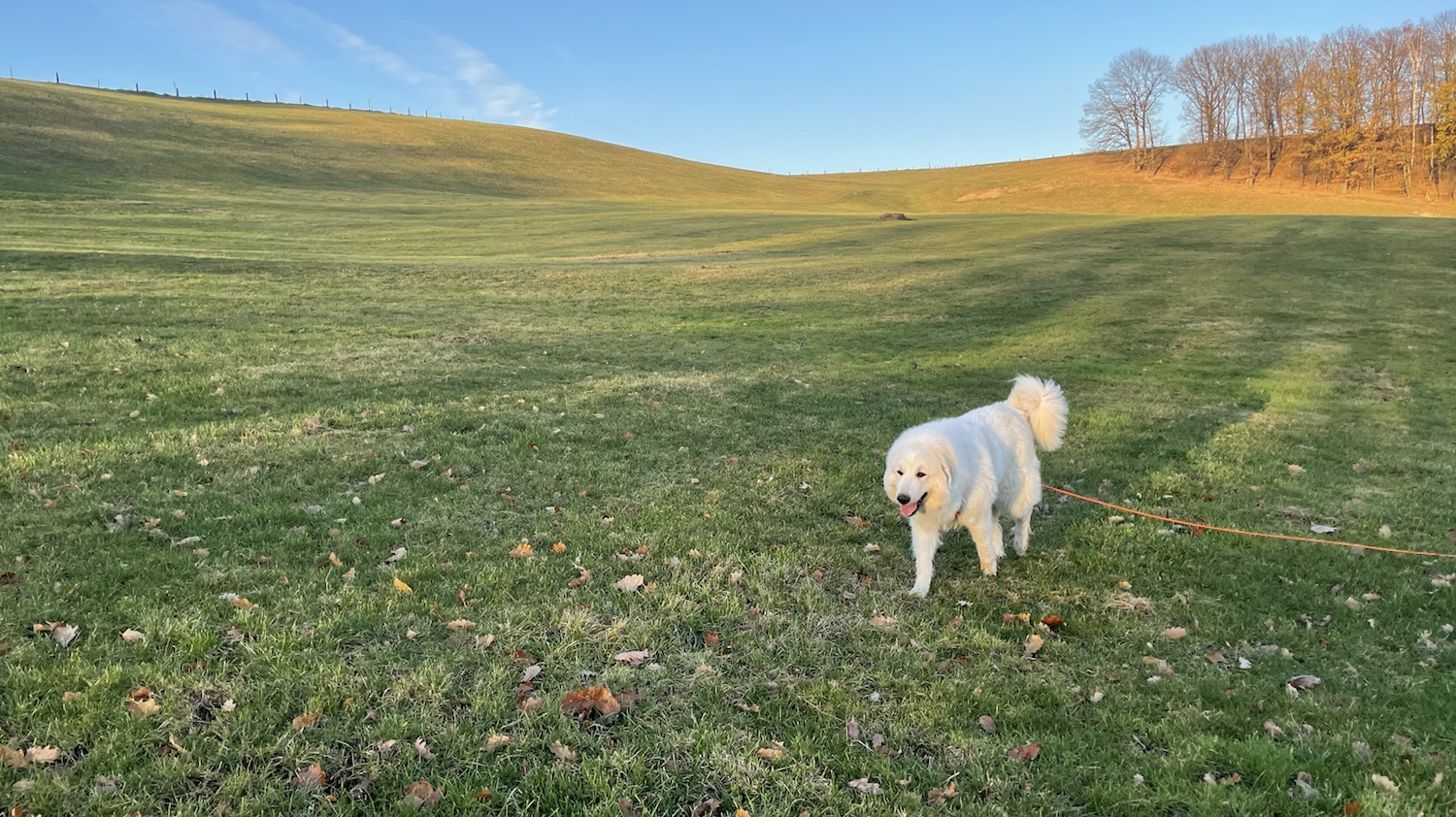 Nachmittags bin ich dann mit meinem großen Mensch spazieren gegangen. Zum großen Feldweg. Da habe ich meine lange orangene Feldleine bekommen und dann habe ich meinen großen Mensch den Feldweg langgeführt. Bis zum kleinen Feldweg. Da sind wir abgebogen und zur großen Wiese gegangen. Ich bin immer vorneweg. Ich kenne mich hier aus!