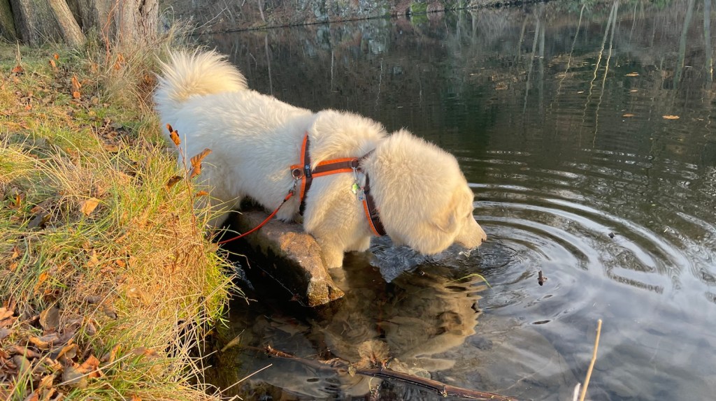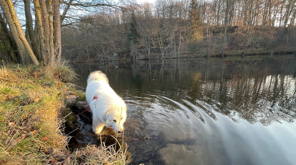 Dann bin ich noch über die Wiese an der Tschooo-Pauuu geschnuffelt und ich habe noch schön Wasser getrunken. Dabei sind natürlich meine Pyripfötchen ganz naß geworden. Das ist aber egal.
