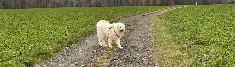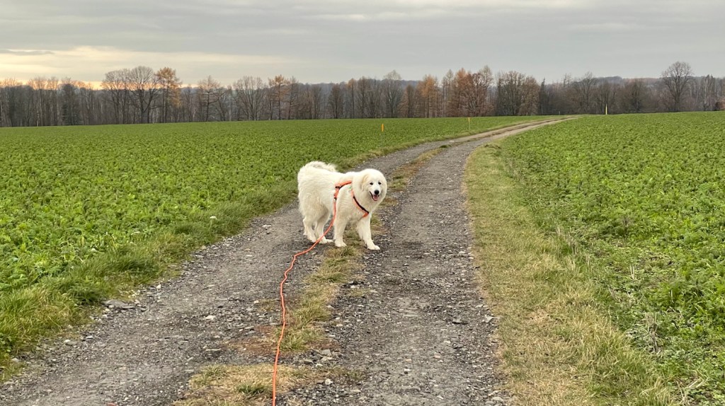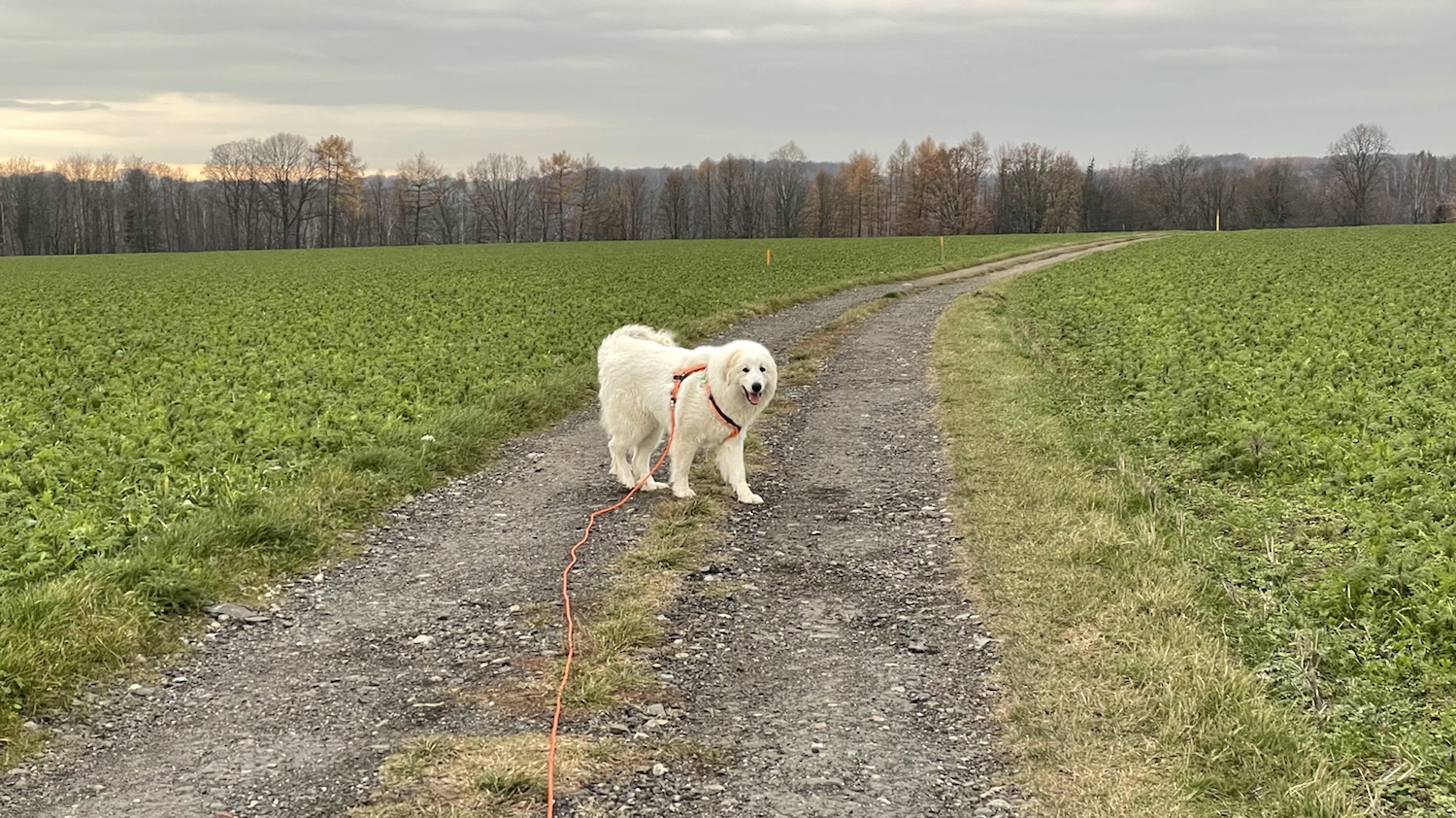 Und dann habe ich mit meinem großen Mensch einen Spaziergang gemacht. Wir sind in Richtung Feldweg gelaufen und dann weiter an der großen Straße entlang bis zum Feldweg der an den Waldrand führt. Da, wo die Kangalin und der Schäferhund wohnen. Die sind heute aber beide nicht da gewesen. Da sind wir weiter am Waldrand lang zur Wiese.