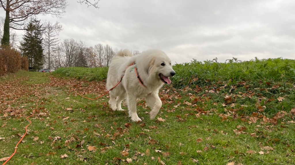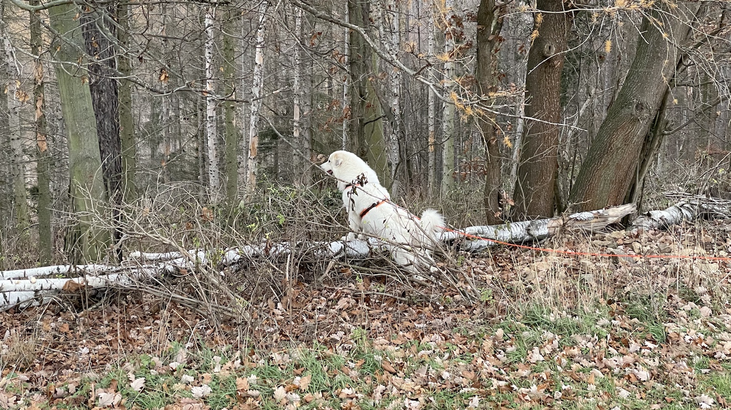 Ich mußte aber immer mal in den Wald reingucken, weiiil, da war was! Ich habe das gemerkt. Jawoll, da war was. Und da habe ich immer geguckt. Ich muß ja aufpassen. Und einmal, da bin ich mit meinem orangenen Geschirr an einem Ast hängengeblieben. Mein großer Mensch hat mich da aber gleich ganz schnell befreit.