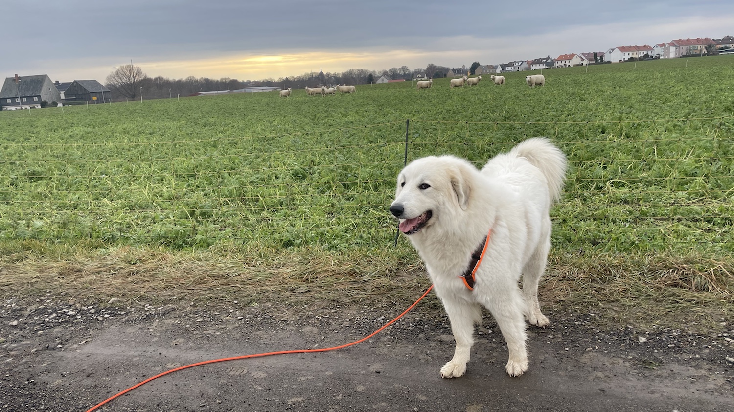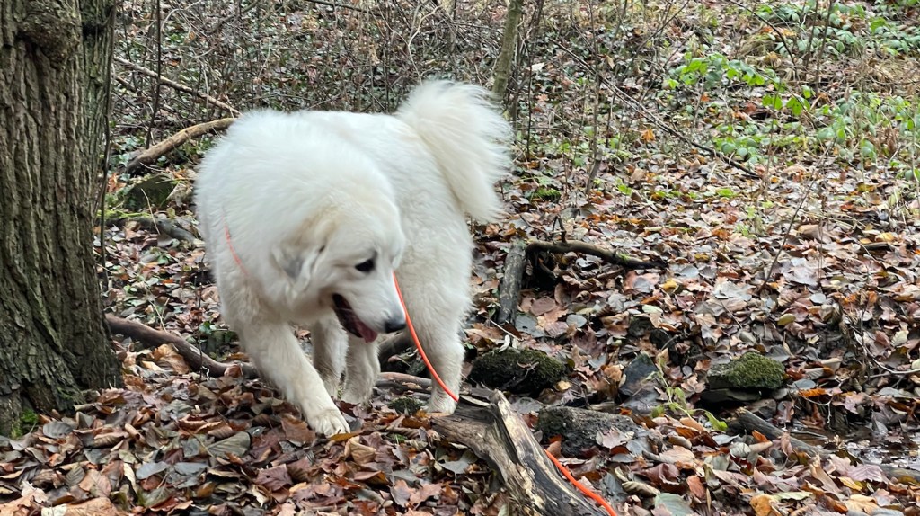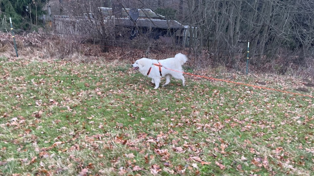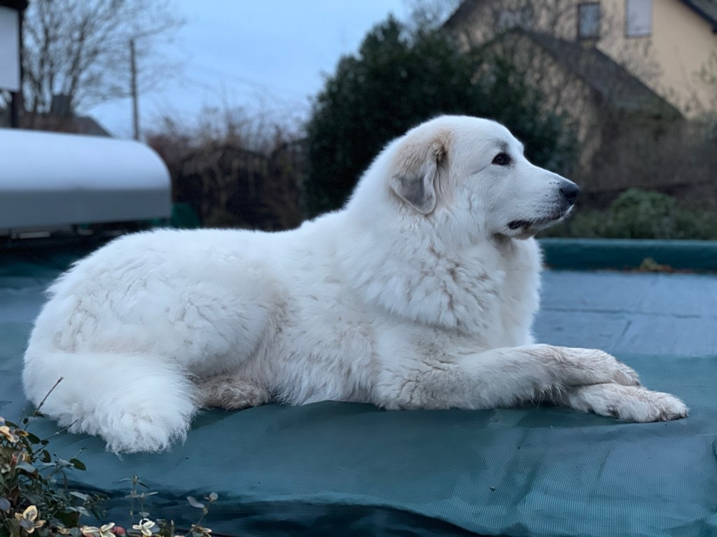 Da war dann schon später Nachmittag, ich habe mich kurz ausgeruht, meinen Garten bewacht und auf mein Abendfutter gewartet. Ganz sehr geschimpft habe ich, wenn jemand an meinem Garten vorbeigelaufen ist. Das macht man so als Herdenschutzhündin. Dann gab es Abendfutter. In meiner Kellerwohnung.