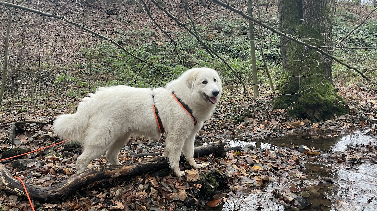 Ich bin weiter zum Waldrand gelaufen und dann am Waldrand lang bis zur Straße. Da bin ich mit meinem großen Mensch dann bis zum kleinen Parkplatz und weiter zum großen Fluß mit dem komischen Namen. Wir sind dann durch den Wald und ein Stück über die große Wiese und wieder in den Wald rein. Und beim kleinen Bächlein habe ich die Lea getroffen und ich war ganz lieb.