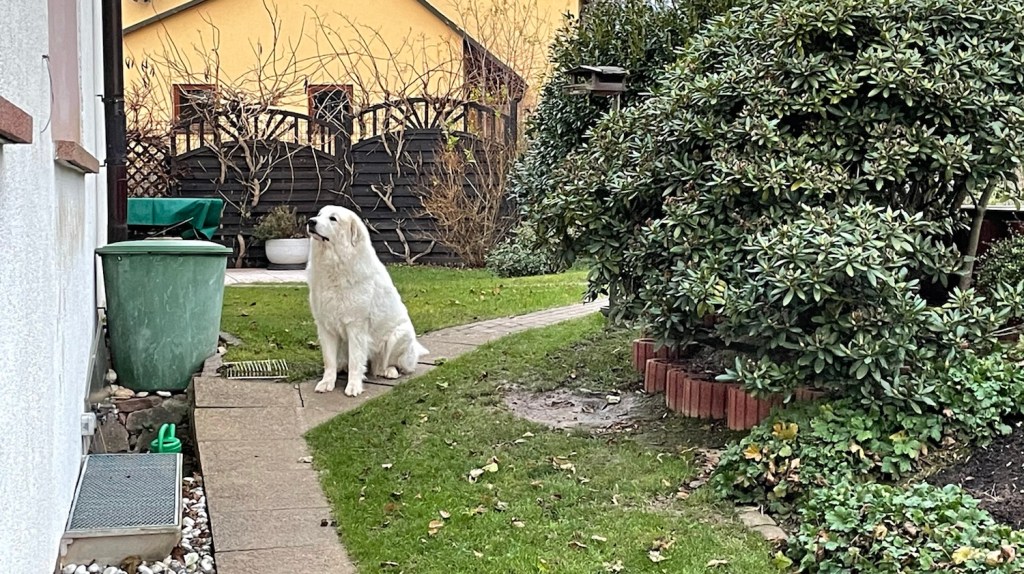 Ich bin dann erstmal wieder raus in meinen Garten und da habe ich gewartet bis wir zum Abendspaziergang aufgebrochen sind. Da hat es geregenwettert. Aber nicht sehr. Ich bin trotzdem mit meinem großen Mensch eine schöne große Runde durch mein Wohngebiet gelaufen. Auch bei der Kira vorbei. Auf dem Heimweg.
