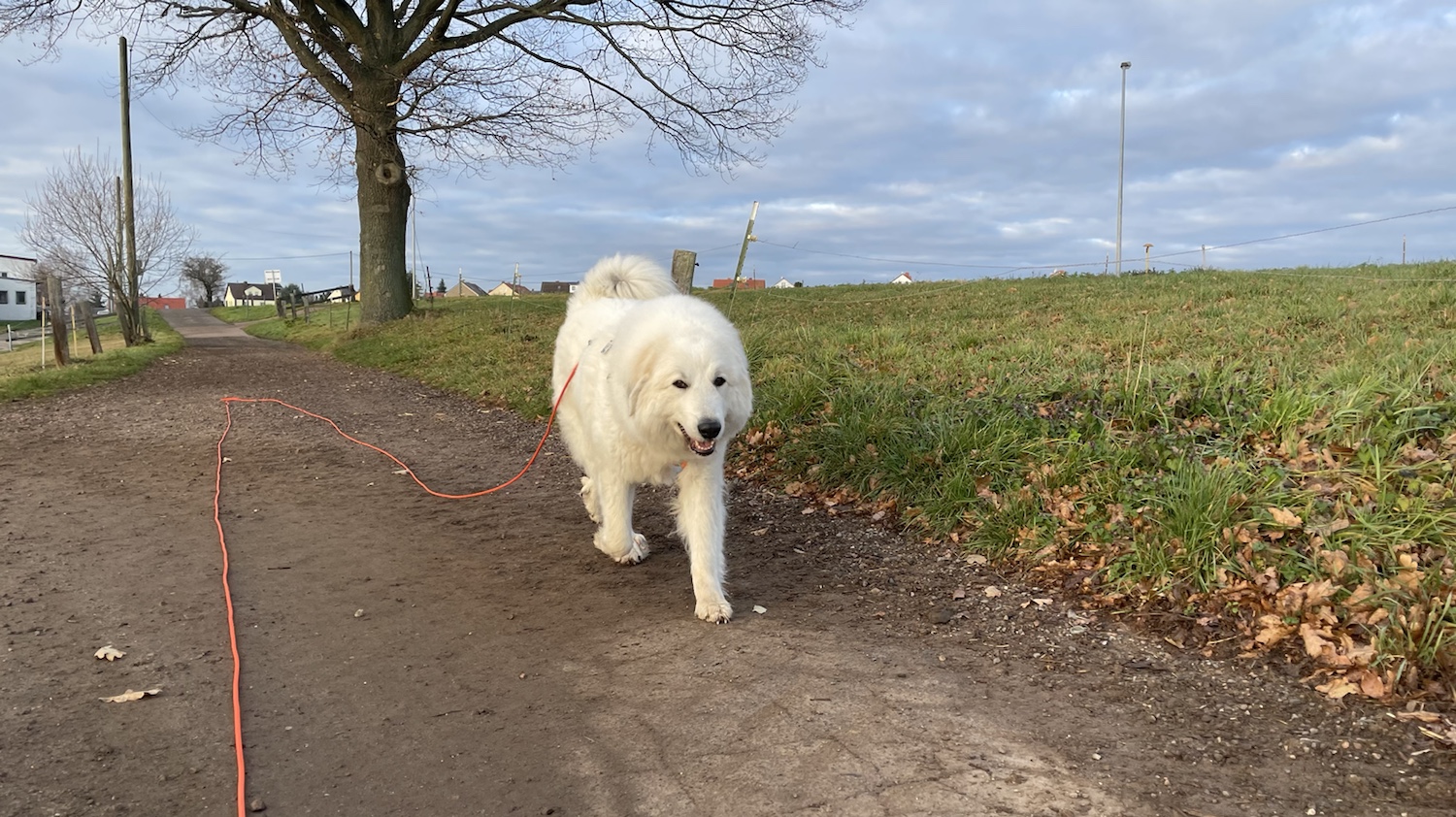 Wir sind dann wieder zur großen Straße und rüber auf die andere Seite. Ich war erstmal noch auf dem Feld und habe Gras gefuttert. Mein großer Mensch nennt mich dann immer kleines Schäfchen. Weiiil, ich sehe da auch so aus. Dann sind wir nach Hause.