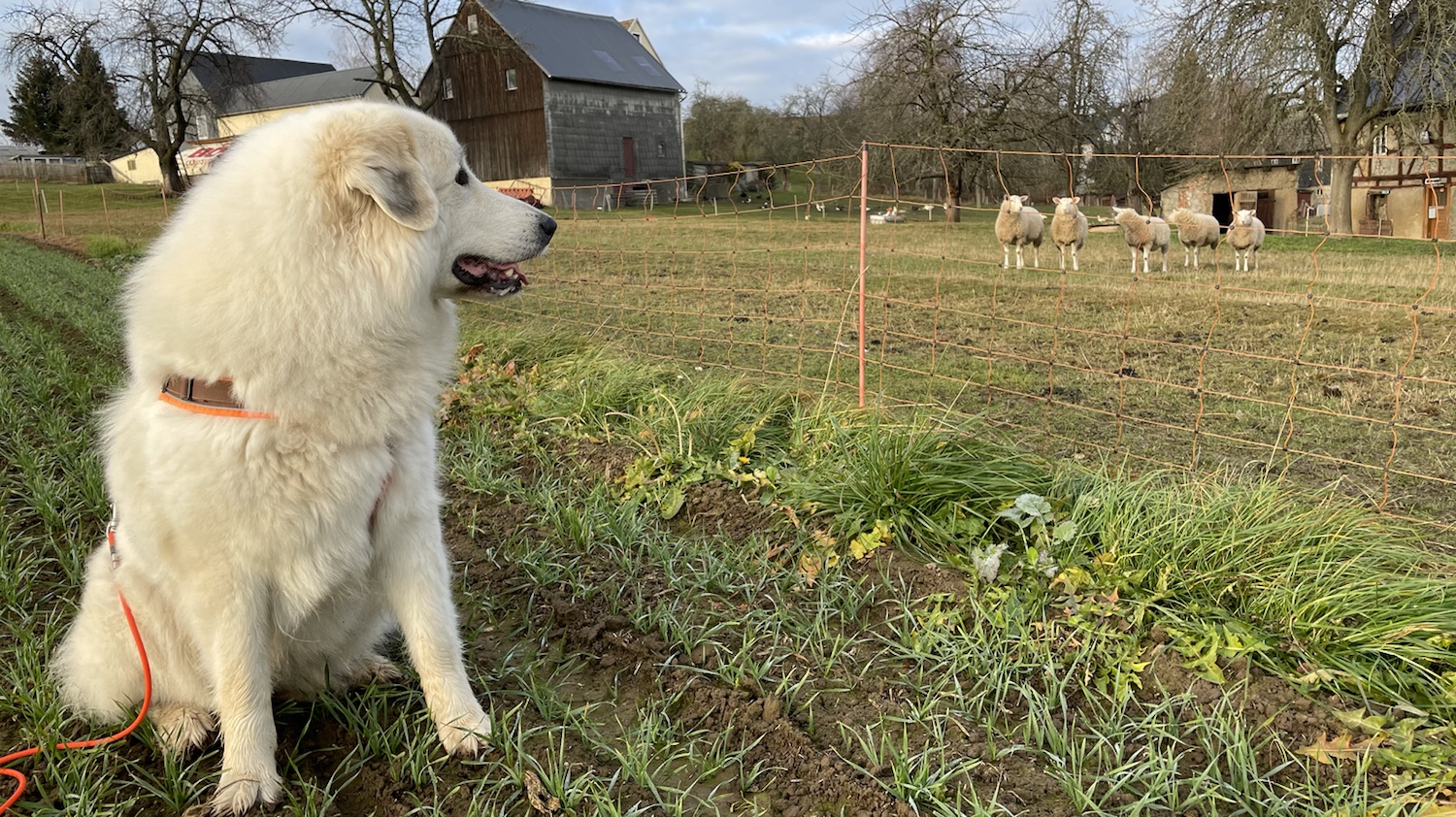Dann sind wir den ganzen kleinen Feldweg langgeschlendert. Bis der zu Ende war. Ich habe überall geschnuffelt. Das kann ich nämlich ganz sehr gut. Jawoll! Und dort am Ende vom kleinen Feldweg sind wir weiter am Feldrand geradeaus gelaufen. Am Stromzaun lang. Und da waren dann Schafs. Oder Schafe. Viele. Die sind zu mir geflitzt gekommen. Dann sind sie wieder ein Stück zurück gerannt, weiiil, die haben gesehen wie groß ich bin. Aber wir haben uns angeguggt. Die Schafs und ich.