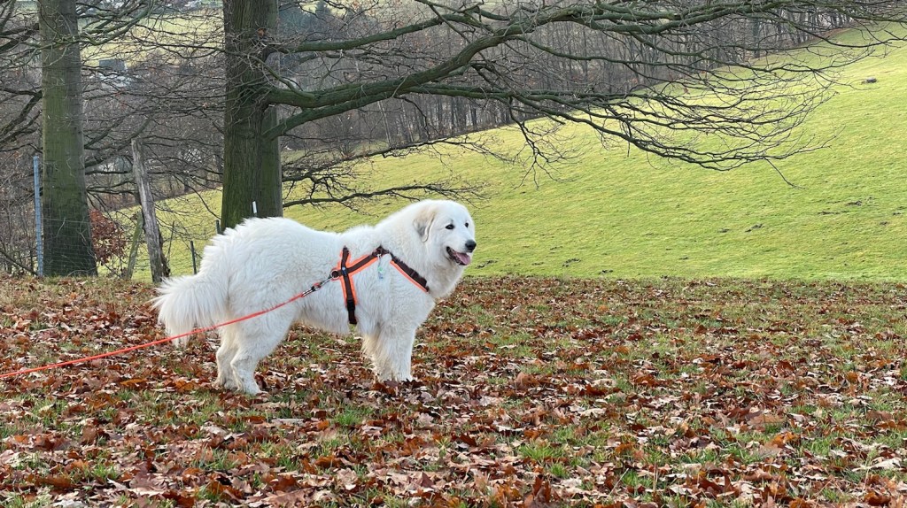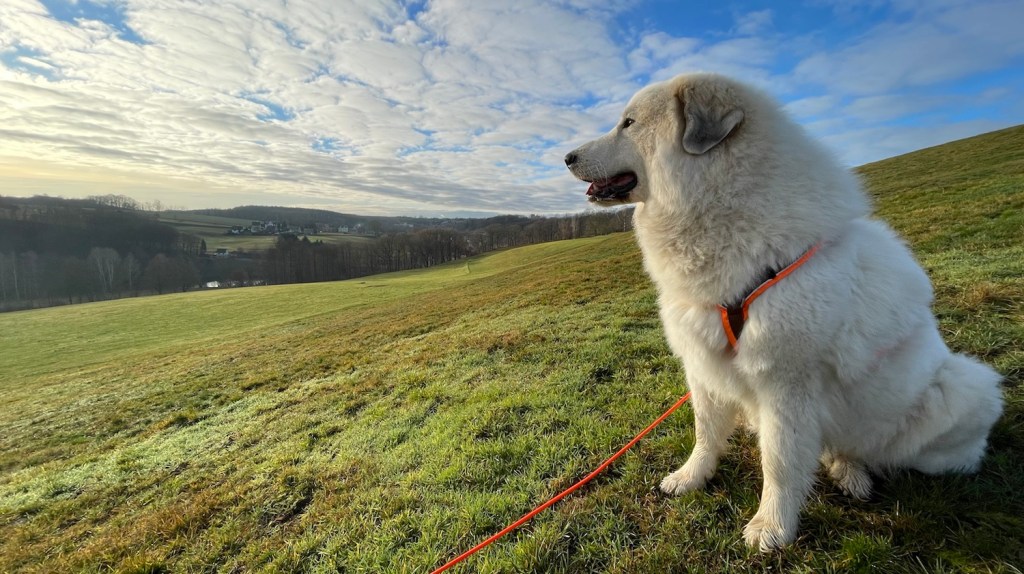 Ich bin mit meinem großen Mensch auf die große Wiese gegangen. So, daß ich den Weg immer im Blick habe. Und da kamen dann zwei Mopse gelaufen. Da war ich erstmal aufgeregt. Aber dann habe ich mit meinem großen Mensch Picknick gemacht. Es kam dann noch ein Hund auf dem Weg, da war ich ganz ruhig.