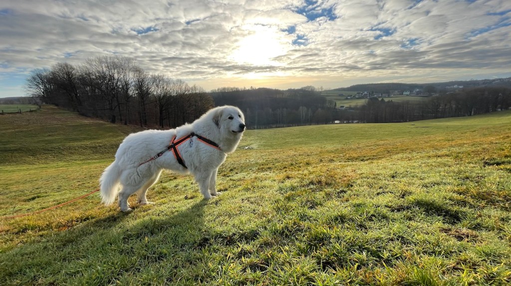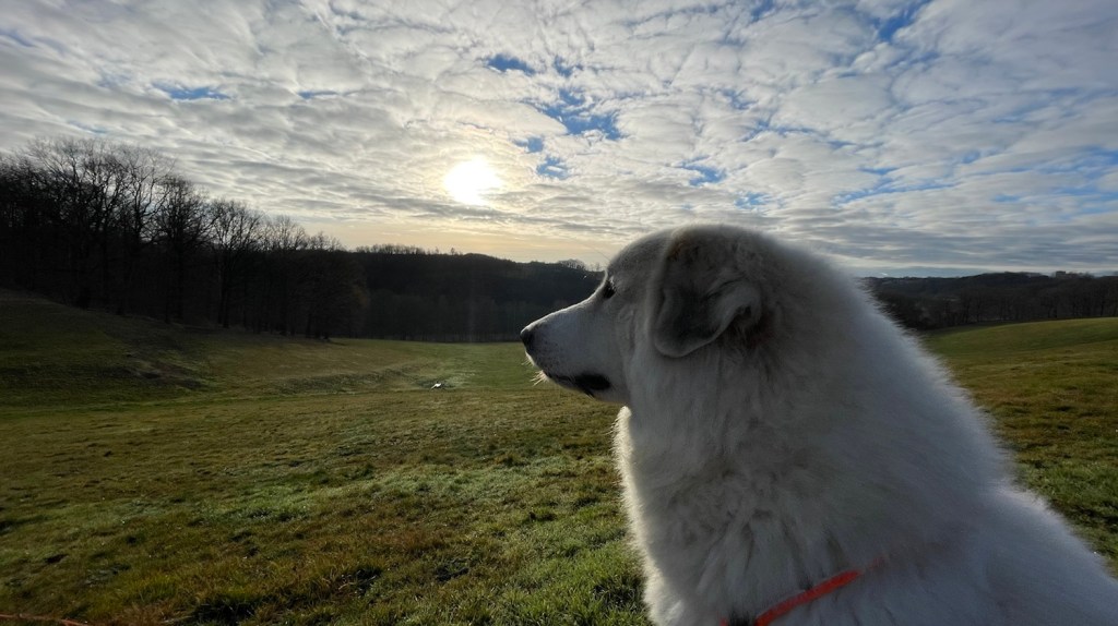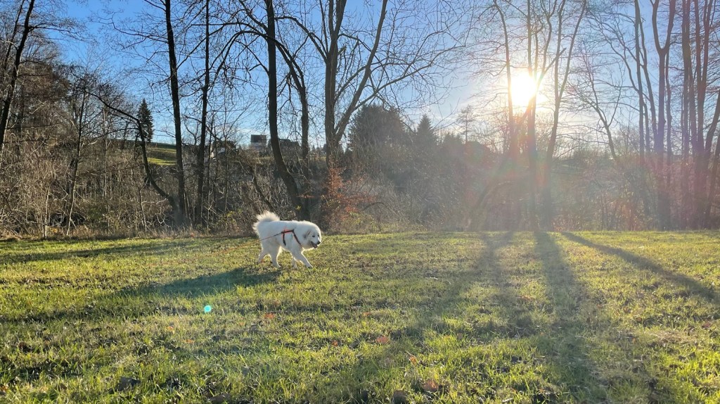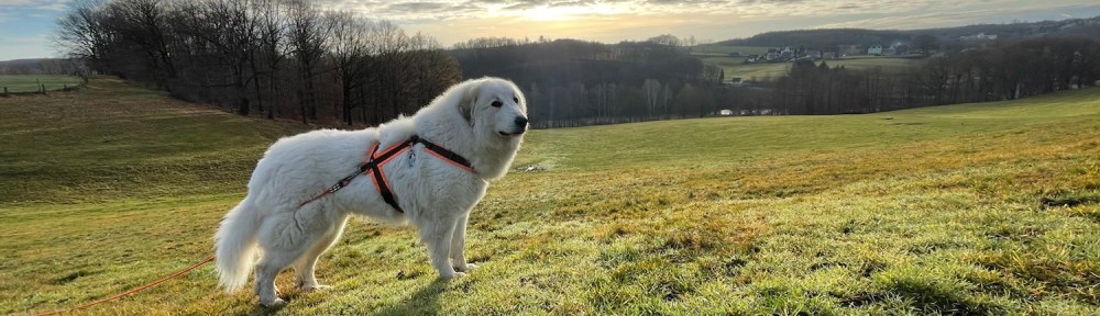 Nach dem Picknick sind wir gemütlich über die großenWiese den Berg hoch und dann über meine große Feldwiese gelaufen. Ich habe Kuhhaufen geschleckt. Da hat mein großer Mensch geschimpft. Ich bin nämlich ganz schlau. Ich kann so laufen, daß mein großer Mensch nicht sieht, wenn ich am Kuhhaufen schlecke. Weiiil, da habe ich einen Trick. Man muß die Nase ganz tief halten und schnuffeln. So, daß das Köpfchen zwischen den Vorderpfötchen ist. Da kann der große Mensch von der Seite nichts sehen. Und noch besser ist es, wenn der Pops zum großen Mensch zeigt. Man kann auch sagen Arsch. Also, zum Pops, nicht zum großen Mensch, das macht man nicht. Aber als Prinzessin sagt man das sowieso nicht. Und ich bin eine Pyriprinzessin. So kann der große Mensch nämlich auch von hinten nichts sehen. Das ist ein guter Trick.