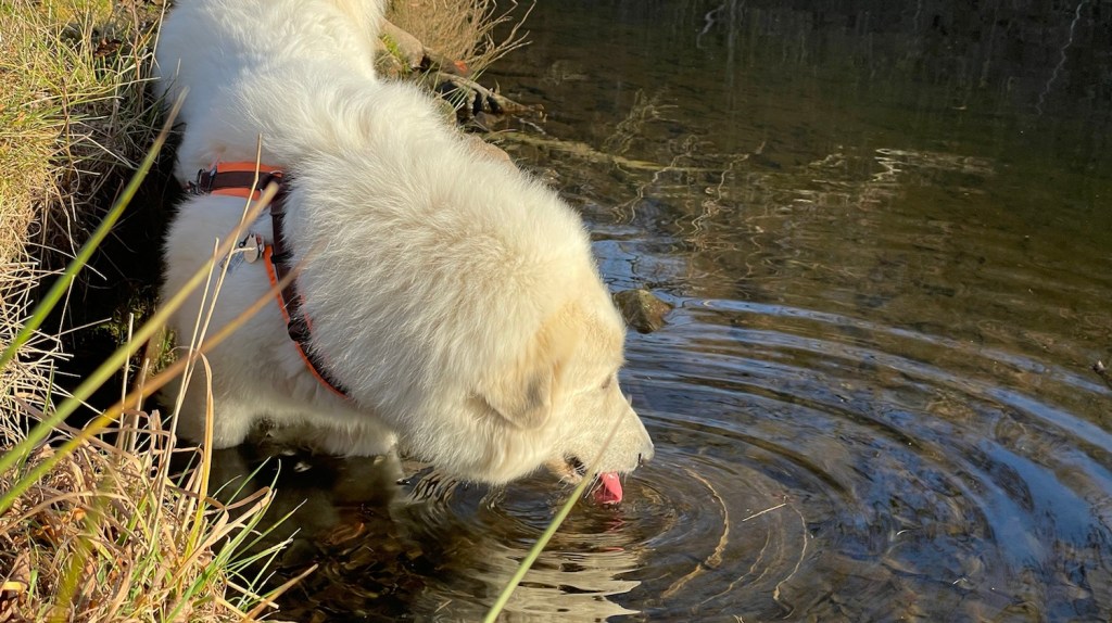 Da bin ich mit meinem großen Mensch dann zur großen Wiese am großen Fluß mit dem komischen Namen gegangen. Und da durfte ich wieder überall schön schnuffeln. Auf der Wiese gibt es ganz viele Maulwurfhaufen. Die schönsten habe ich markiert. Damit jeder gleich weiß, die sind der Bella. Und Wasser habe ich getrjnken, in der Tschooo-Pauuu. Und ganz viele Menschen waren unterwegs auf dem Wanderweg.