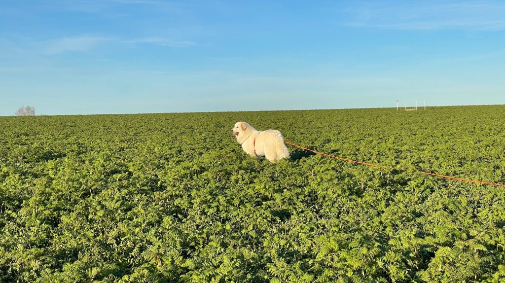 Aber gleich ganz kurz danach haben wir einen schönen Morgenspaziergang gemacht. Zu meiner großen Feldwiese und auf dem großen Feldweg lang. Bis zum kleinen Feldweg. Den wollte ich dann langlaufen. Aber da kam auf dem großen Feldweg ein Hund. Den mußte ich erstmal genau beobachten.