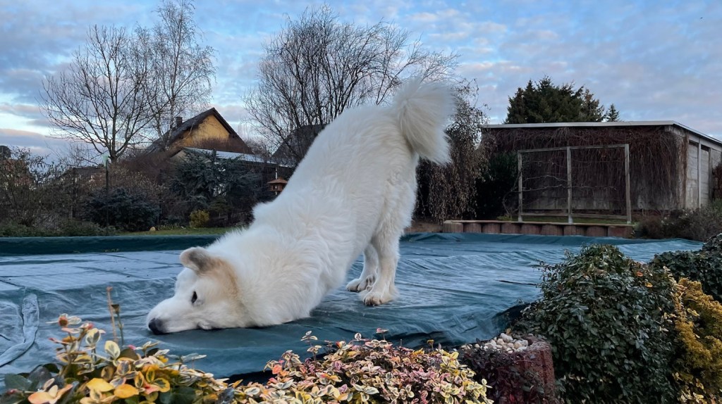 Zu Hause habe ich mich ausgeruht und meinen Garten bewacht. Meine liebe Sonne ist mich dann in meinem Garten besuchen gekommen. Nachmittags sind meine Menschenschwestern nach Hause gekommen und die habe ich begrüßt. Da wollte ich nämlich gerade wieder mit meinem großen Mensch spazieren gehen.