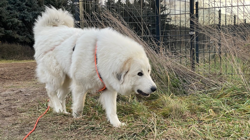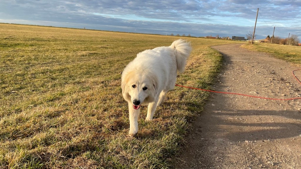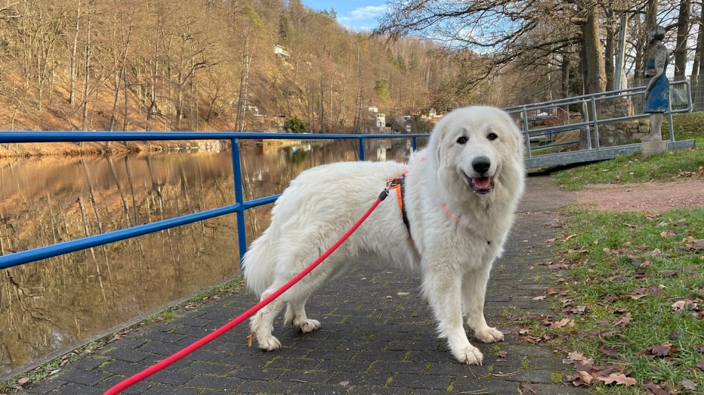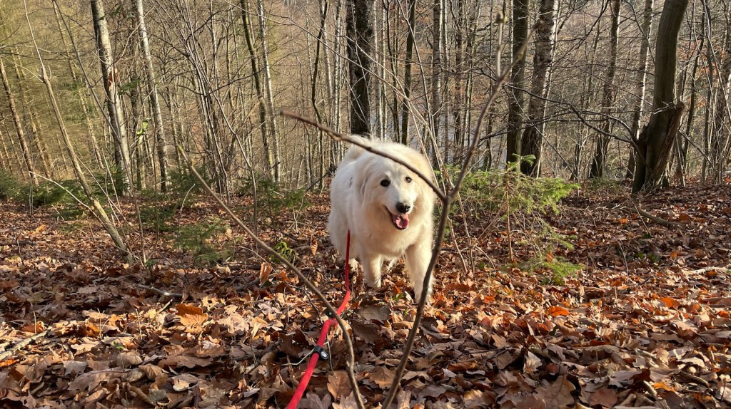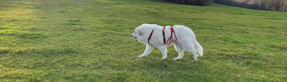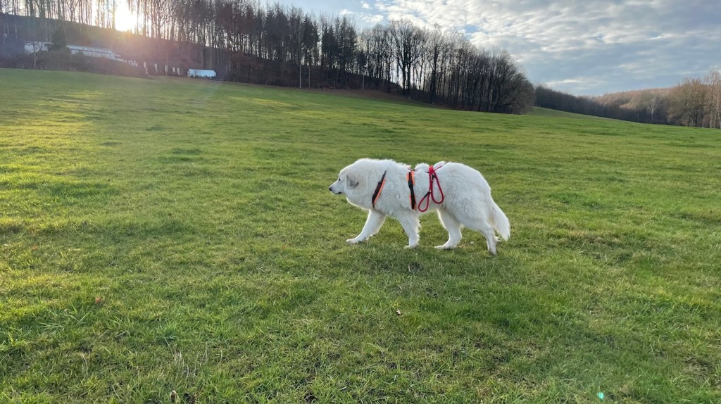 Und dann kam auch schon gleich mein großer Mensch wieder zu mir und wir sind zum Sonntagsspaziergang aufgebrochen. Zuerst durch mein Wohngebiet. Da mußte ich brav „Fuß“ laufen. Und weil ich das so fein gemacht habe, gab es dann an der großen Wiese hinter meinem Wohngebiet gleich meine lange Feldleine und dann durfte ich überall schnuffeln.