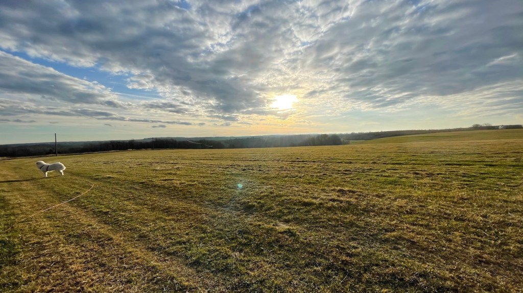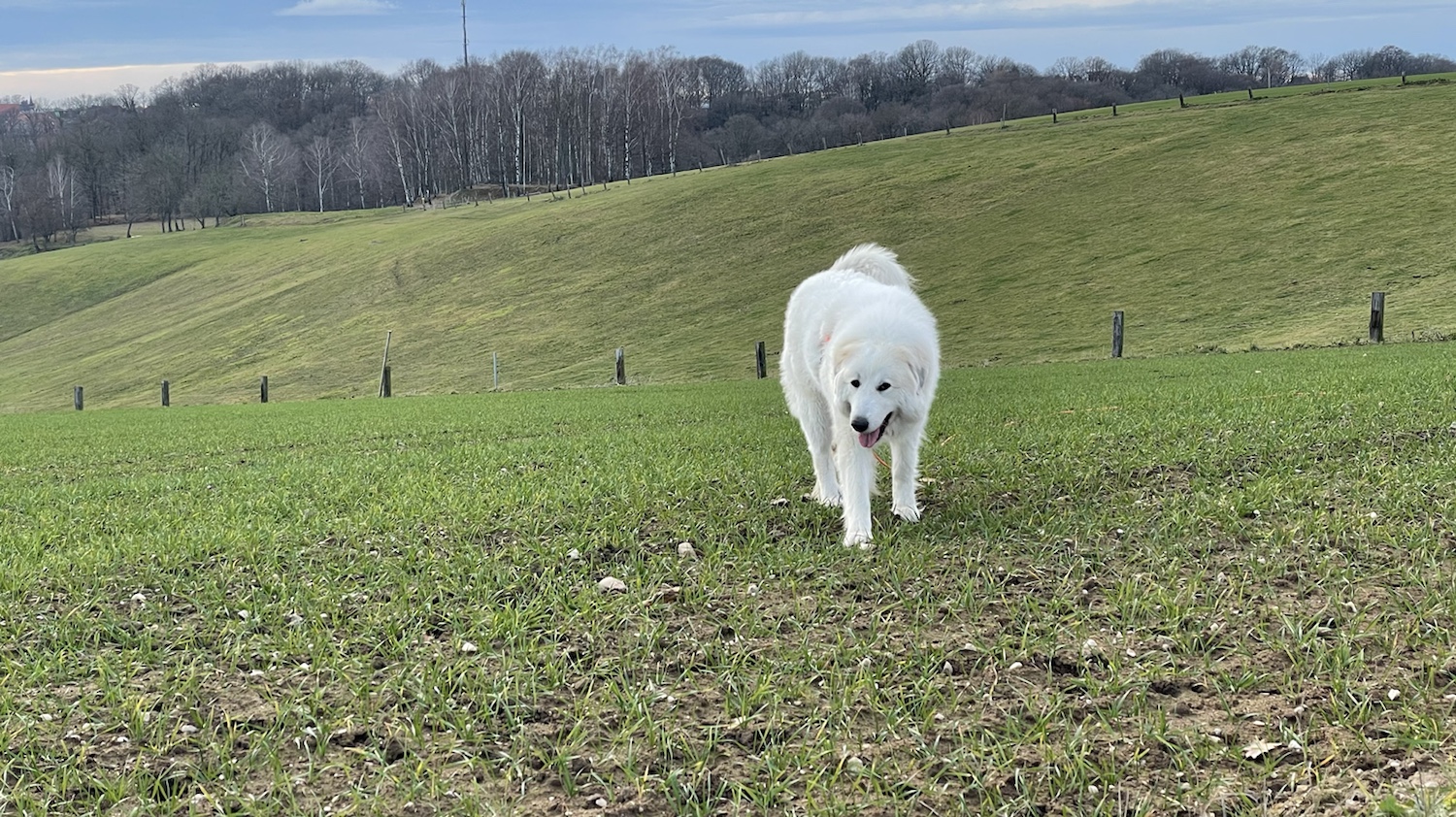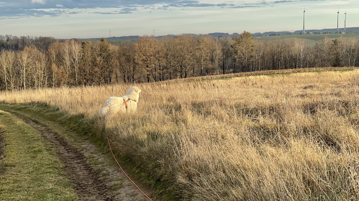 Wir sind erstmal über die große Wiese und da haben wir schon einen Hund gesehen, der auch einen Sonntagsspaziergang gemacht hat. Dann bin ich mit meinem großen Mensch zur kleinen Wiese. Da sind uns gleich nochmal zwei Hunde entgegen gekommen. Ein größerer und ein ganz winzig kleiner. Aber ich bin über die Wiese geschnuffelt und habe Gras geknabbert.