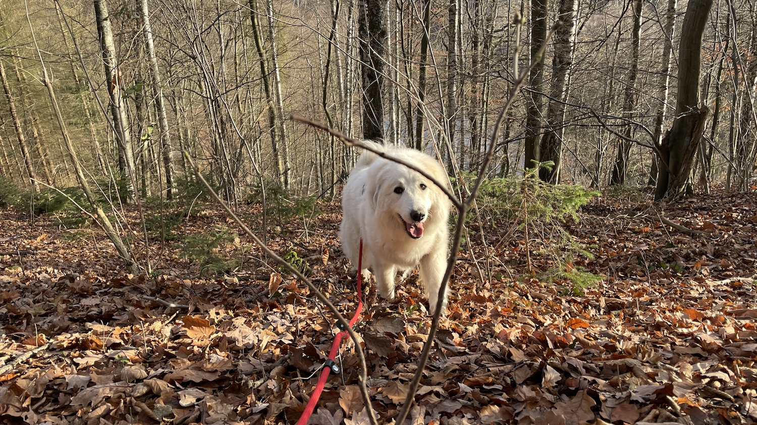 Wir sind dann weiter über die Wiesen gelaufen. Die sind jetzt ganz flach abgemäht. Nur zwei Wiesen haben noch ganz hohes Gras. Und da habe ich geschnuffelt. Mit meiner Pyrinase. Weiiil, da waren bestimmt die Rehe im hohen Gras. Das hat meine Pyrinase erschnuffelt.