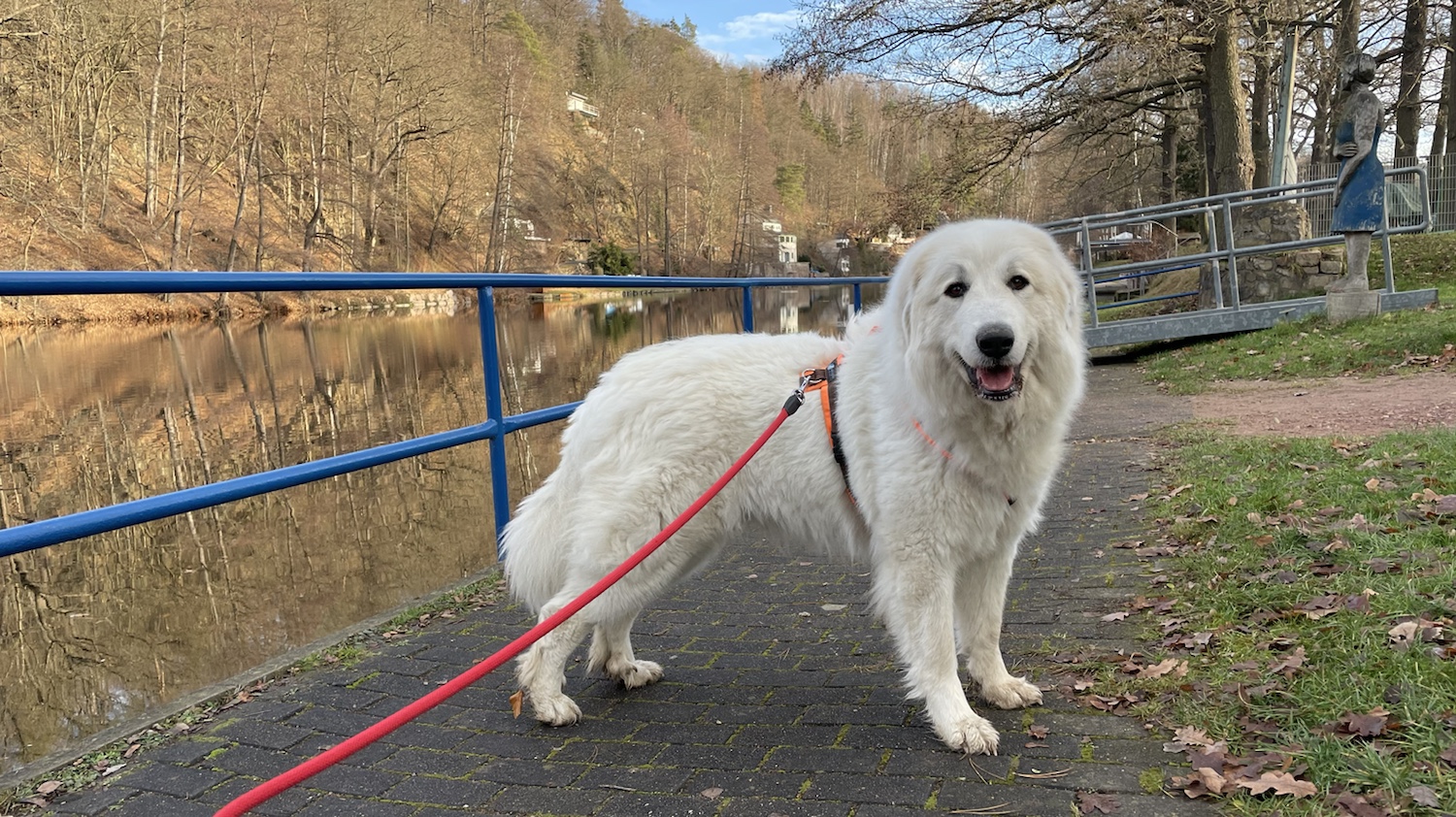 Dann ging es weiter. Immer schön durch den Wald in Richtung Fuchsfarm. Vorher habe ich meinen großen Mensch aber abgebogen. Weiter durch den Wald und über die Wiese zum großen Fluß mit dem komischen Namen. Das ist nämlich der richtige Weg. Da muß man langlaufen.