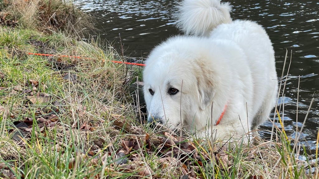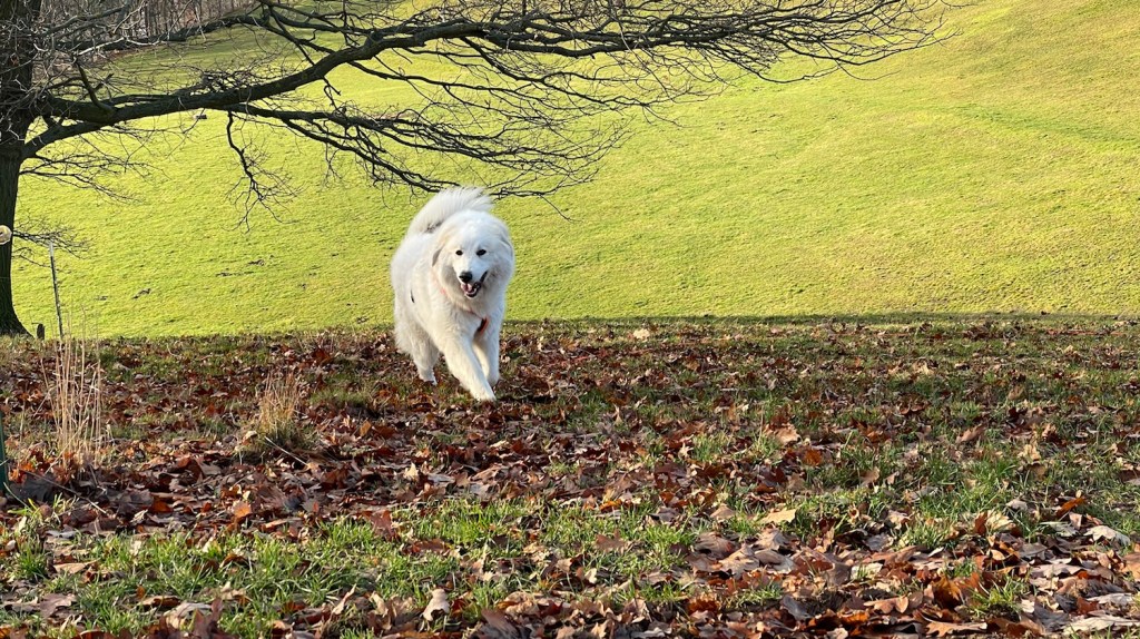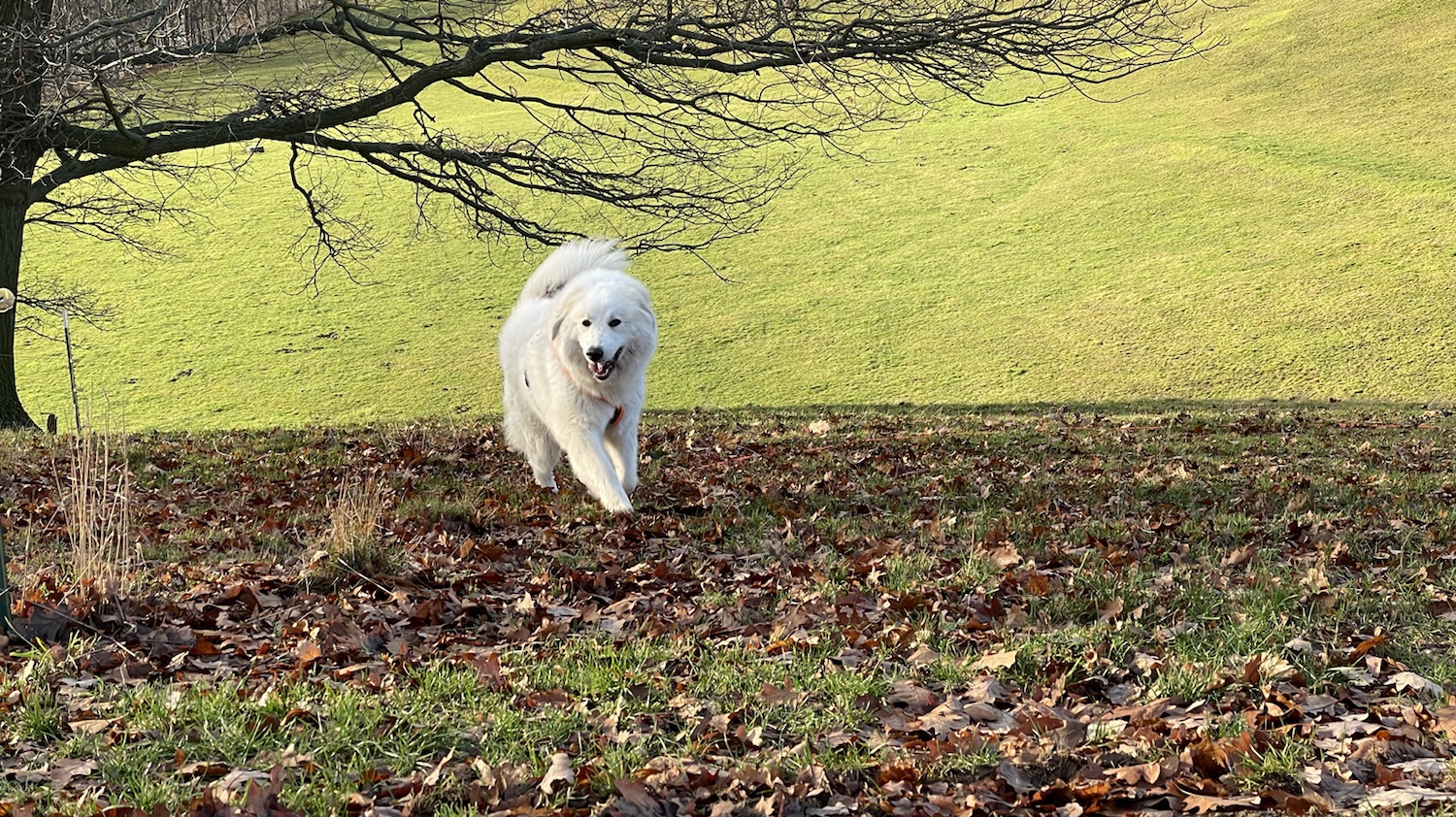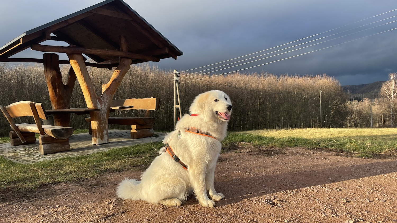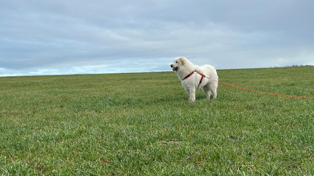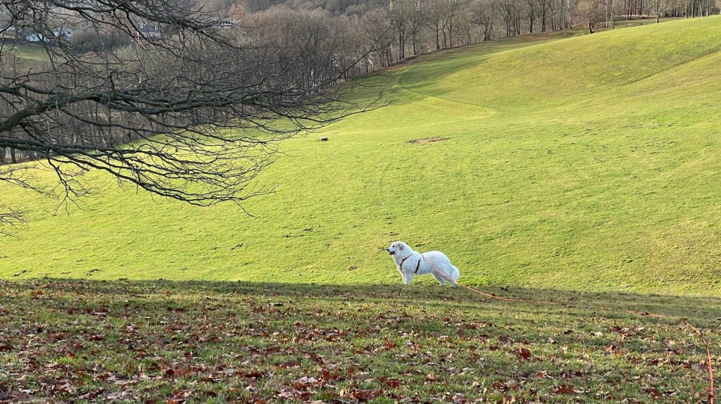 Dann sind wir aber losgewandert, mein großer Mensch und ich, die Bella. Zum großen Feldweg sind wir gelaufen und da kam uns ein riesiger weißer Schäferhund entgegen. Das war der Bogolf und den kenne ich. Wir sind aber weiter zum kleinen Feldweg und von da aus zur großen Wiese. Mein großer Mensch ist aber nicht mit mir zum großen Fluß mit dem komischen Namen gegangen, sondern weiter über die Wiese am Waldrand.