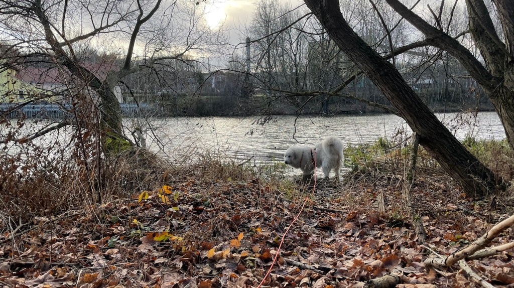 Dann sind wir weiter in den Wald und immer am großen Fluß mit dem komischen Namen entlang. Ich bin auch mal an den großen Fluß ran und mit meinen Pfötchen da rein. Pyripfötchen kühlen. Dann sind wir auf den Wanderweg gekommen und auf die Wiese am großen Fluß gegangen. Und da habe ich einen Hund getroffen. Einen Jungen. Mit dem habe ich gespielt. Dann sind wir weiter und ich habe nochmal was getrunken.