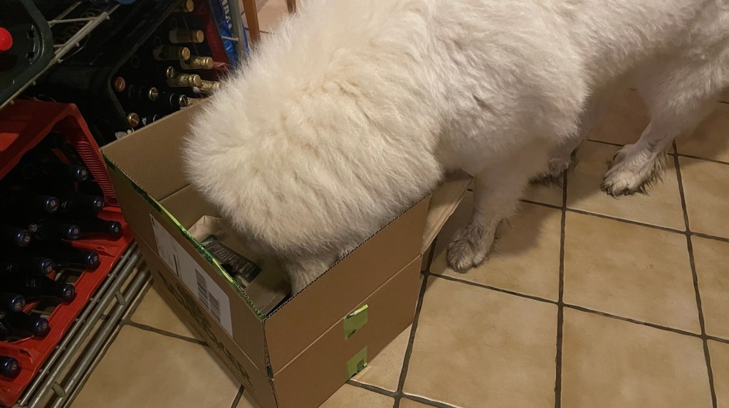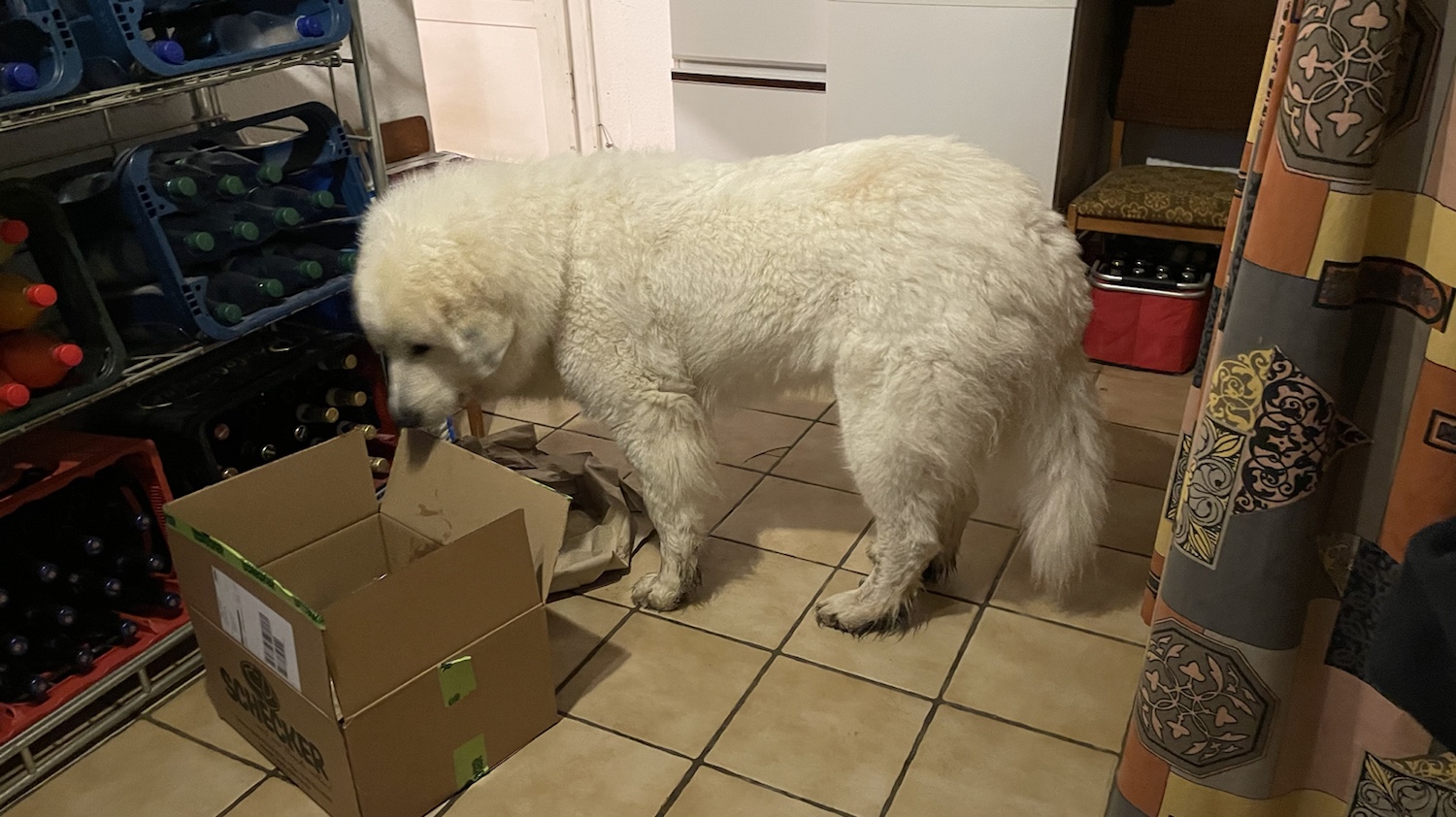 Und dann sind meine Menschen in meine Kellerwohnung gekommen und die Bella hat ihr Weihnachtsgeschenk bekommen. Ich durfte den Karton ganz selber auspacken. Das hat mir vielleicht Freude gemacht. Ich packe gerne Geschenke aus. In dem Paket waren ganz viele leckere Knabbereien für die liebe Bella. Ganz leckere! Und ich durfte gleich welche probieren. Die waren ganzganz lecker und die hat meine Menschenmami für mich gebäckert. Dochdochdochdochdoooch, man sagt gebäckert, sagt man, jawoll!