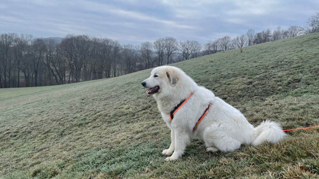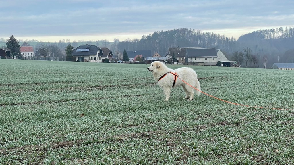 Dann sind wir losgegangen. Mein großer Mensch und ich, seine Bella. Morgenspaziergang. Ich habe vorsichtshalber gleich mal die Führung übernommen. Das ist wichtig. Ich bin nämlich eine Pyri und habe ein stures Köpfchen. Und ich kann entscheiden. Das ist auch wichtig.