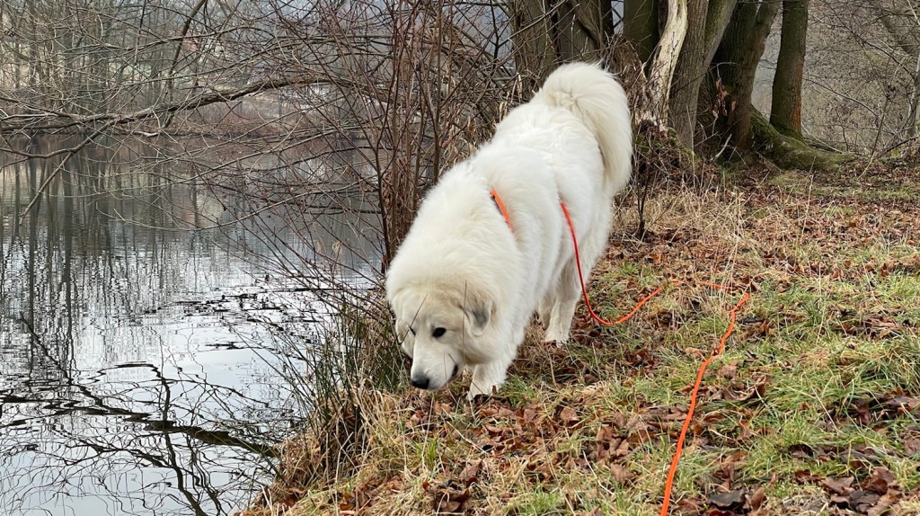 Da bin ich dann ans Wasser und habe geschnuffelt und getrunken. Und den Reiher und die Kormorane haben wir auch gesehen. Wir sind dann über die Wiese und mein großer Mensch wollte wieder über die große Wiese nach Hause. Ich nicht. Ich wollte durch den Wald am großen Fluß lang. Und da habe ich geguggt. Das kann ich. Ich bin eine Pyri und ich weiß genau, wie ich guggen muß. Und ein Mädchen bin ich auch noch.