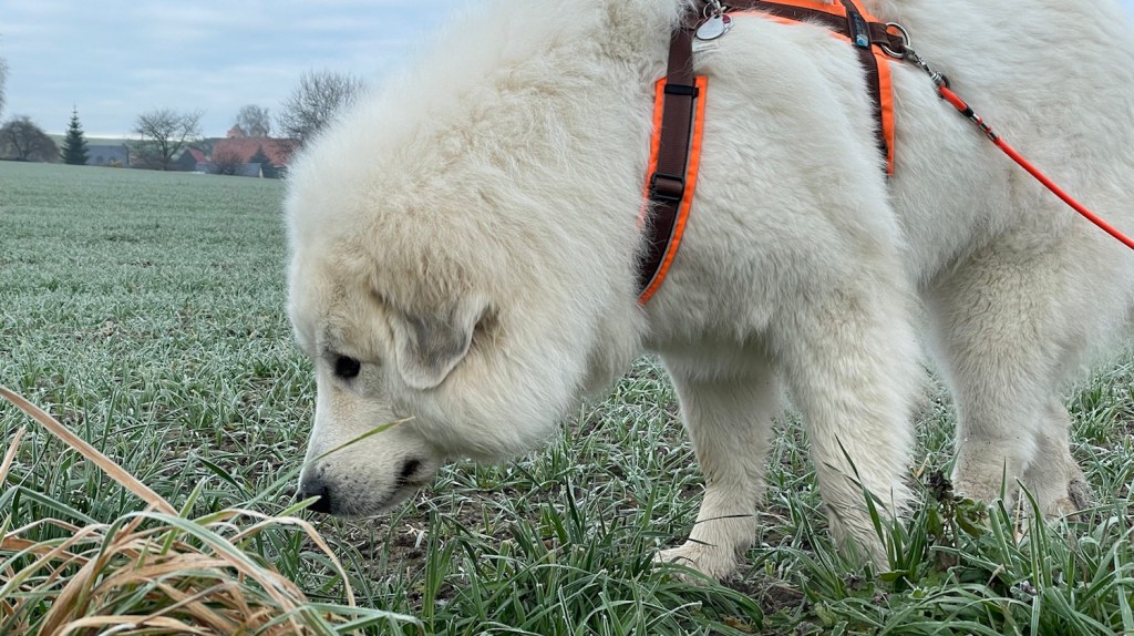 Wir sind dann also immer am großen Fluß mit dem komischen Namen lang durch den Wald gewandert. Bis zum Wasserwerk und da sind wir aus dem Wald raus auf die Wiese. Und da habe ich ganz viel geschnuffelt. Wir sind über die Wiese am Waldrand zurück zur großen Wiese gelaufen. Unterwegs habe ich Picknick gemacht. Erst habe ich Gras gezupft, dann mit meinem großen Mensch Trockenfutter gefuttert.