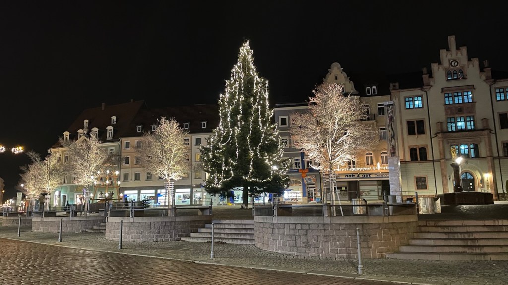 Den Abendspaziergang habe ich heute mit meinem großen Mensch und meiner großen Menschin gemacht. Wir sind zur großen Stadt gelaufen. Ich war ganz brav. Und auf dem Heimweg sind wir zum Marktplatz gelaufen. Da war ich auch schon. Der sieht abends immer ganz schön aus. Mit ganz viel Licht. Und ein großer belichterter Baum steht da. Den darf ich aber nicht markieren, weiiil, der gehört nicht mir. Sagt mein großer Mensch.