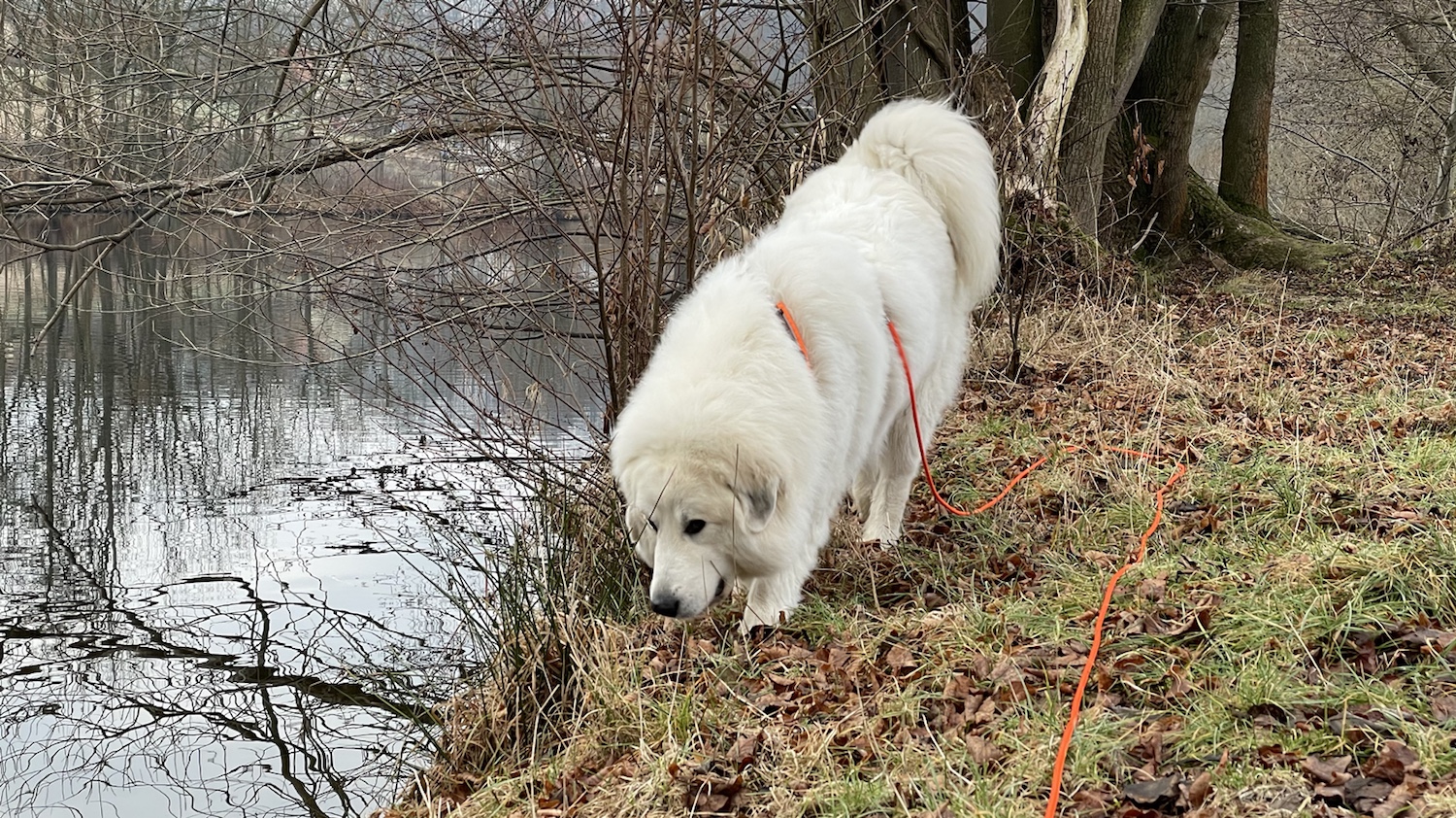 Da bin ich dann ans Wasser und habe geschnuffelt und getrunken. Und den Reiher und die Kormorane haben wir auch gesehen. Wir sind dann über die Wiese und mein großer Mensch wollte wieder über die große Wiese nach Hause. Ich nicht. Ich wollte durch den Wald am großen Fluß lang. Und da habe ich geguggt. Das kann ich. Ich bin eine Pyri und ich weiß genau, wie ich guggen muß. Und ein Mädchen bin ich auch noch.
