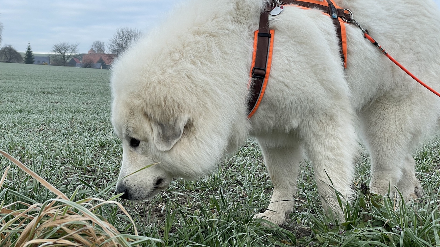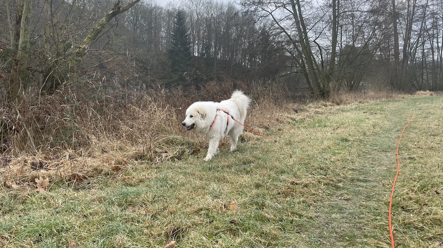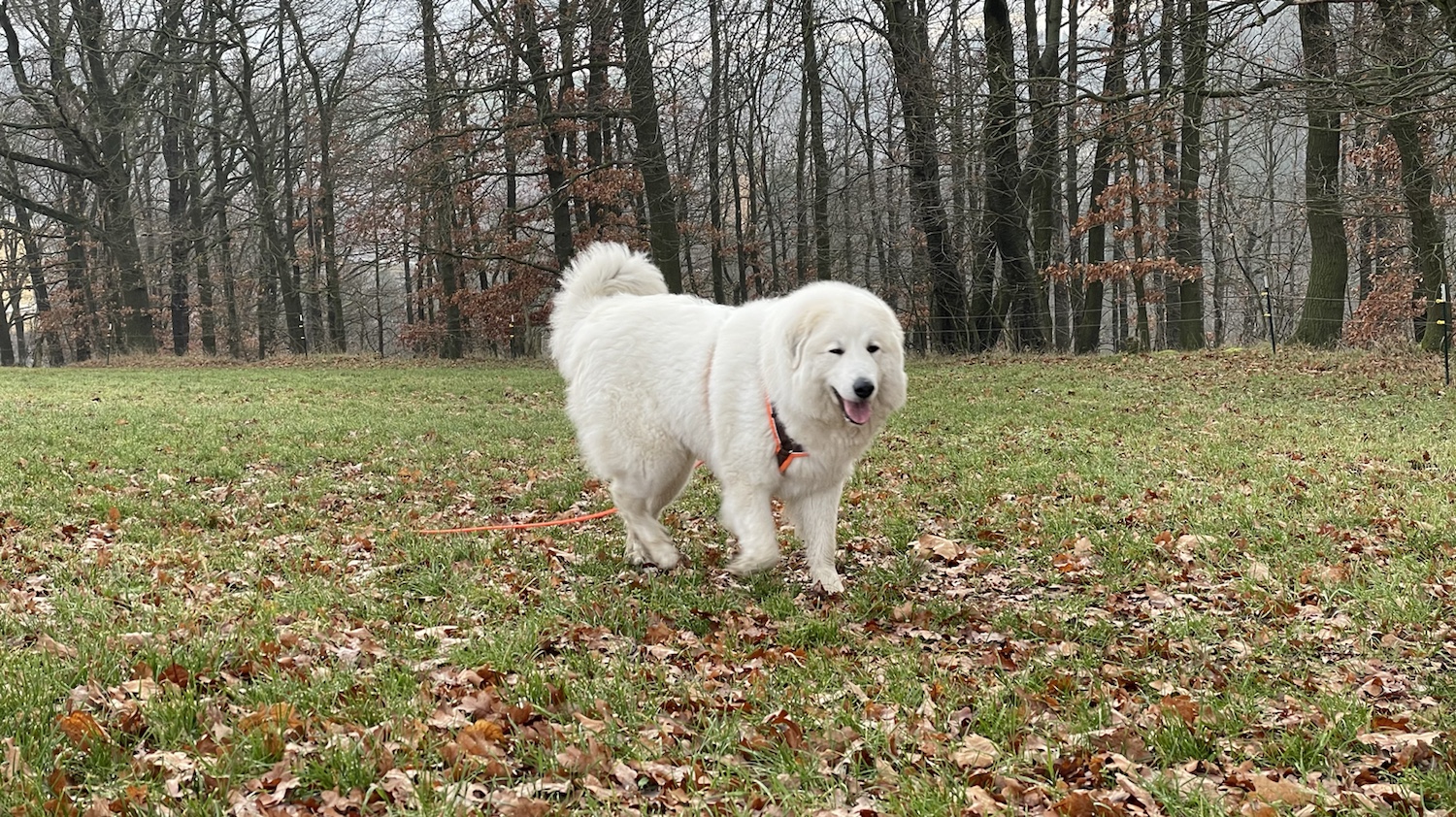 Dann sind wir losgegangen. Mein großer Mensch und ich, seine Bella. Morgenspaziergang. Ich habe vorsichtshalber gleich mal die Führung übernommen. Das ist wichtig. Ich bin nämlich eine Pyri und habe ein stures Köpfchen. Und ich kann entscheiden. Das ist auch wichtig.